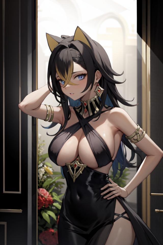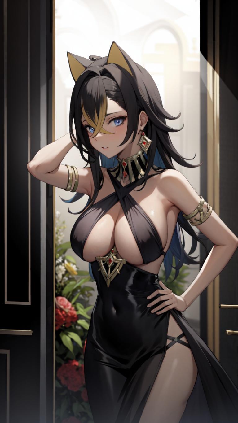 1girl, alternate costume, animal ears, arm behind head, arm up, armlet, armpits, bangs, bare arms, bare shoulders, black dress, black hair, blonde hair, blue eyes, cleavage, covered navel, cowboy shot, criss-cross halter, crossed bangs, dark skin, dark-skinned female, doorway , dress, earrings, flower, gem, hair between eyes, hair intakes, halter dress, halterneck, hand on hip, jewelry, large breasts, long hair, looking at viewer, multicolored hair, parted lips, pelvic curtain, red flower, red gemstone, side slit, solo, standing, streaked hair, two-tone hair