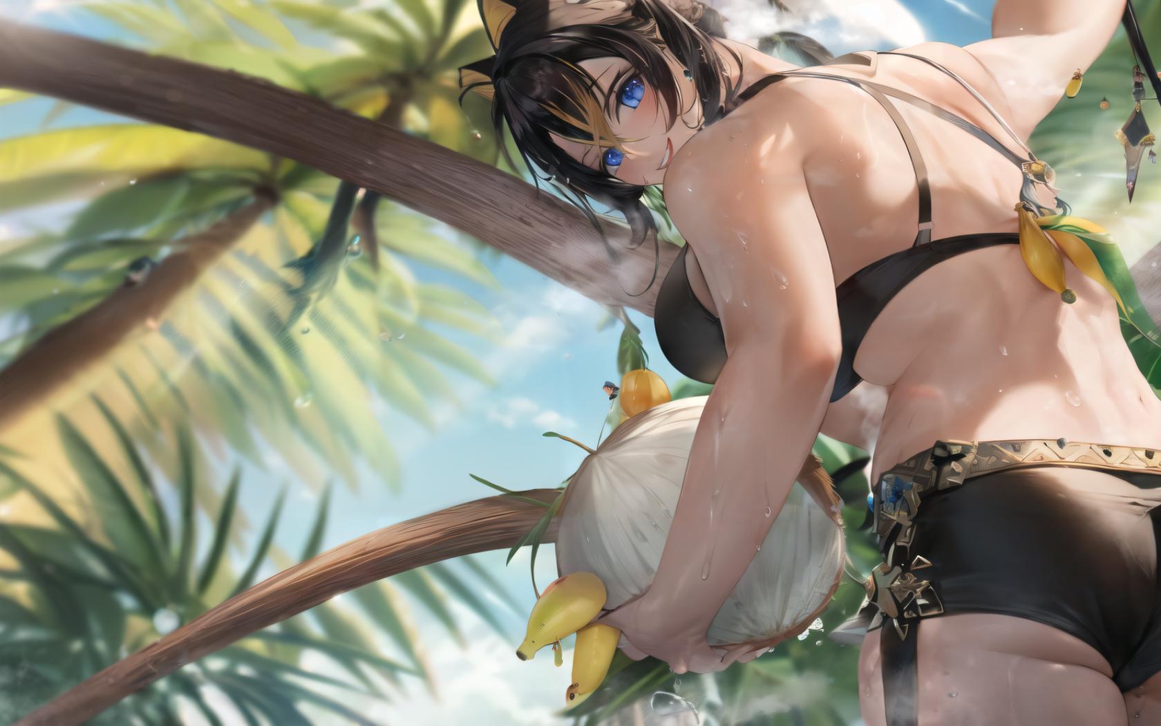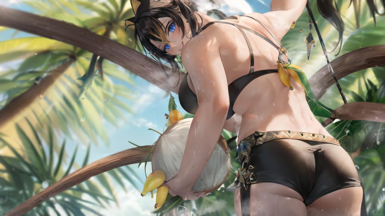 1girl, ass, back, ball, bangs, bare arms, bare shoulders, beachball , bikini, black bikini, black hair, black shorts, blonde hair, blue eyes, blush, day, earrings, from behind, hair intakes, holding, jewelry, large breasts, looking at viewer, looking back, multicolored hair, outdoors, shorts, smile, solo, streaked hair, swimsuit, tree, wet