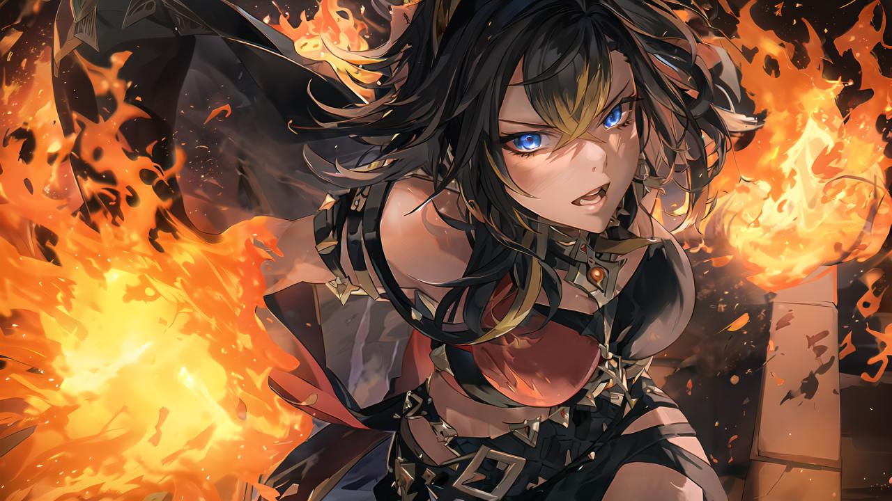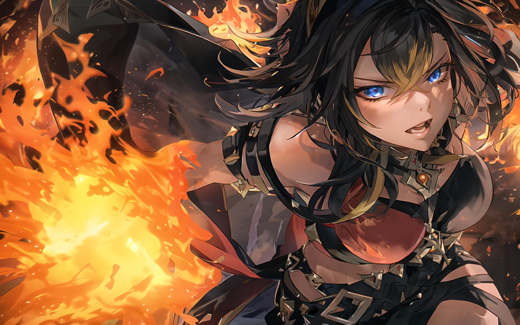 1girl, animal ears, armlet, bangs, bare shoulders, belt, black hair, blonde hair, blue eyes, colored tips, criss-cross halter, crossed bangs, dark skin, dark-skinned female, fire, flame , hair between eyes, halterneck, jewelry, large breasts, long hair, looking at viewer, multicolored hair, open mouth, solo, streaked hair