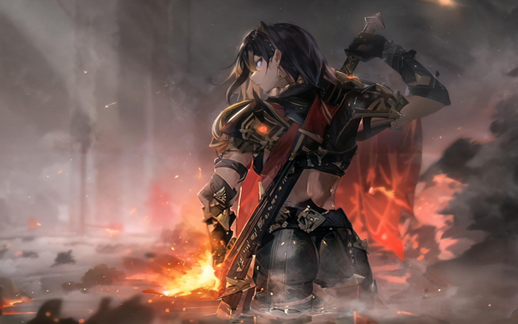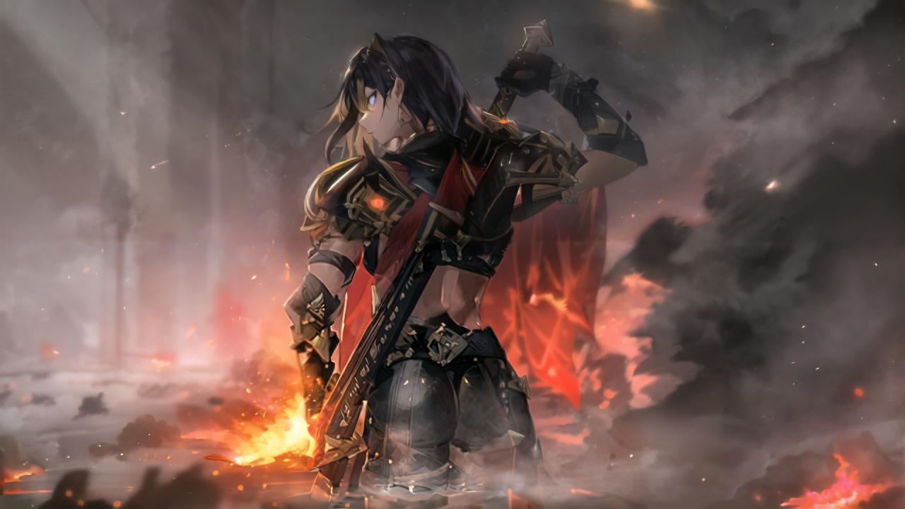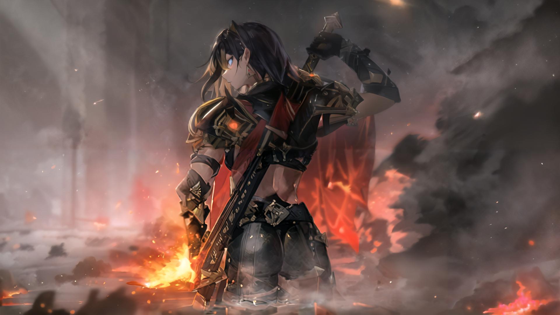 1girl, armor, ass, bangs, black hair, black shorts, blue eyes, dangle earrings , dark skin, dark-skinned female, earrings, fire, from behind, gloves, holding, holding sword, holding weapon, jewelry, long hair, looking at viewer, looking back, multicolored hair, pauldrons, shorts, shoulder armor, solo, sword, weapon