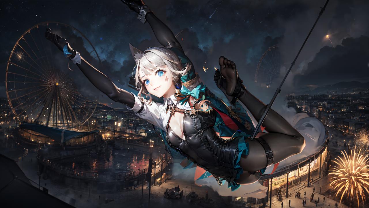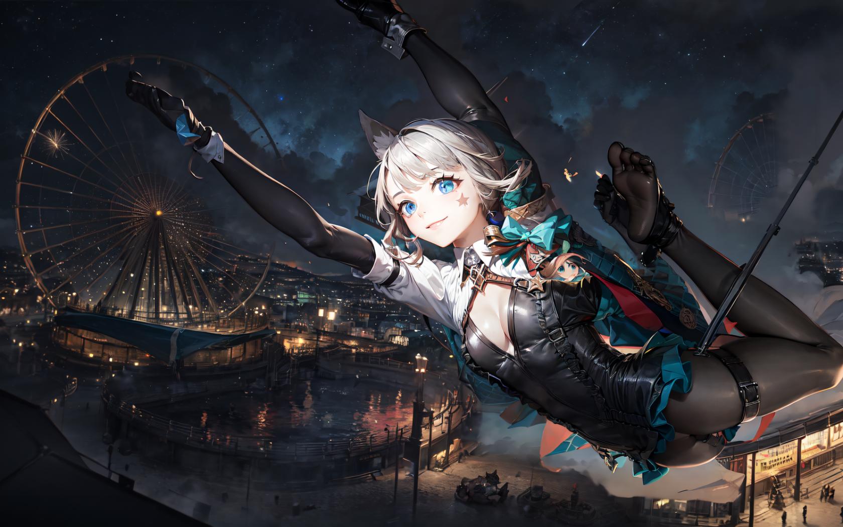 1girl, animal ears, arms up, ass, bangs, bdsm, black gloves, blue eyes, bondage, bound, bound legs, bow, braid, bug, building, butterfly, city, cleavage, earrings, elbow gloves, facial mark, feet, ferris wheel , fireworks, full body, gloves, hairband, hanging, jewelry, latex, medium breasts, night, night sky, no shoes, outdoors, pantyhose, restrained, shiny clothes, short hair, skirt, sky, small breasts, smile, soles, solo, star (sky), starry sky, tattoo, thigh strap, twin braids, white hair