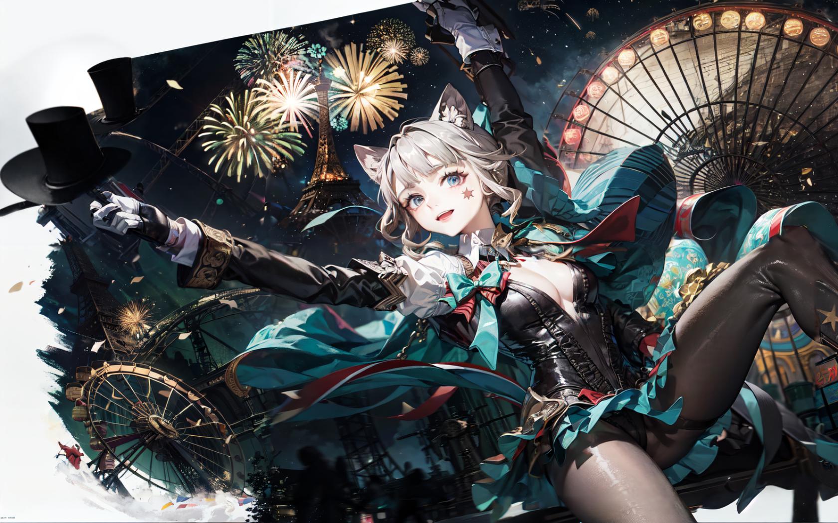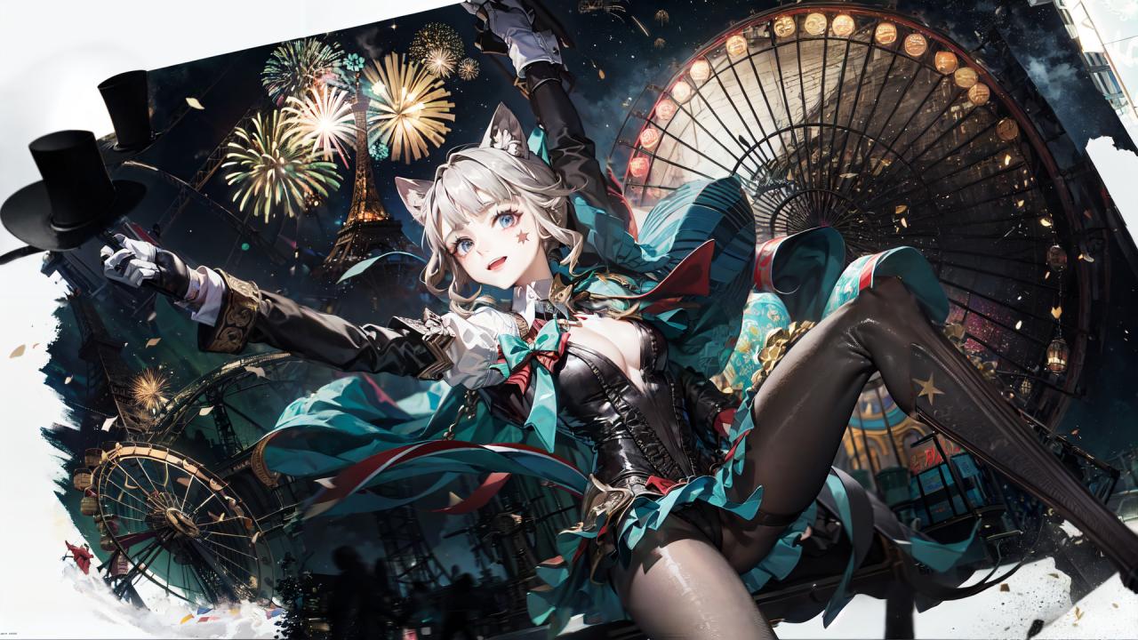 1girl, animal ear fluff, animal ears, arms up, bangs, black footwear, black leotard, black pantyhose, blue eyes, bow, bowtie, braid, cat ears, cleavage, facial mark, ferris wheel , fireworks, gloves, grey hair, hat, holding, jacket, leotard, long hair, long sleeves, looking at viewer, medium breasts, night, open mouth, outdoors, panties, pantyhose, shiny clothes, skirt, sky, smile, solo, top hat, umbrella, underwear, white gloves