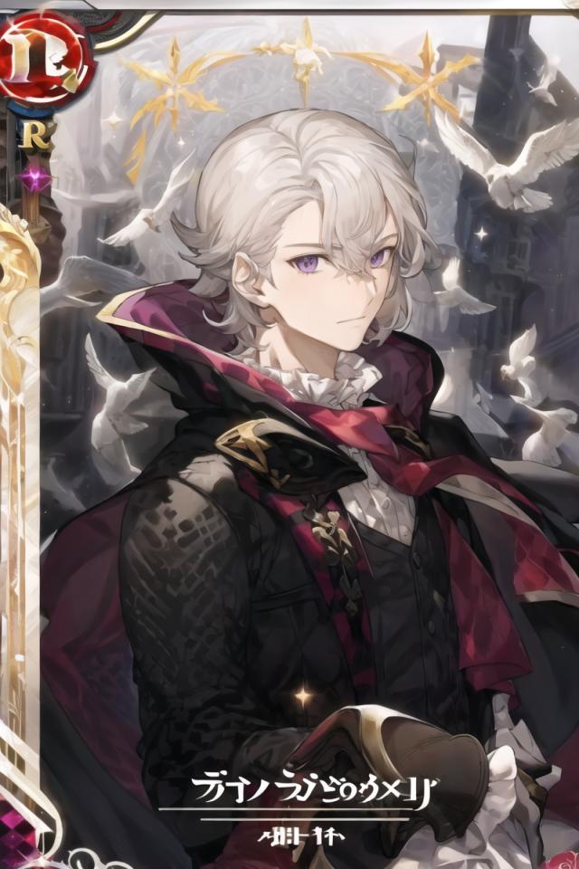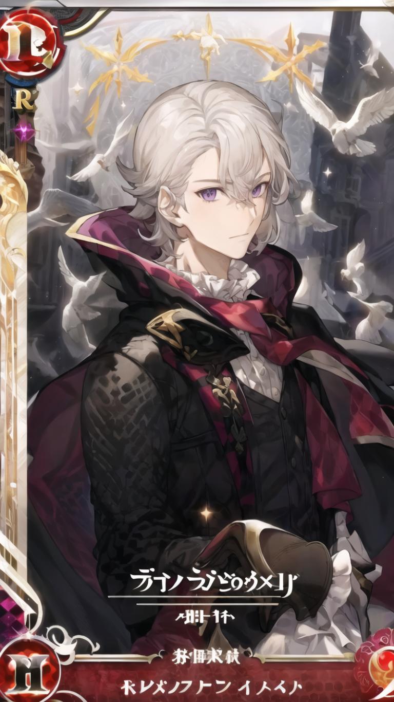1boy, ascot, bangs, bird, black jacket, black vest, cape, closed mouth, dove , frilled sleeves, frills, grey hair, hair between eyes, long sleeves, looking at viewer, male focus, purple eyes, shirt, short hair, solo, upper body, vest, white shirt