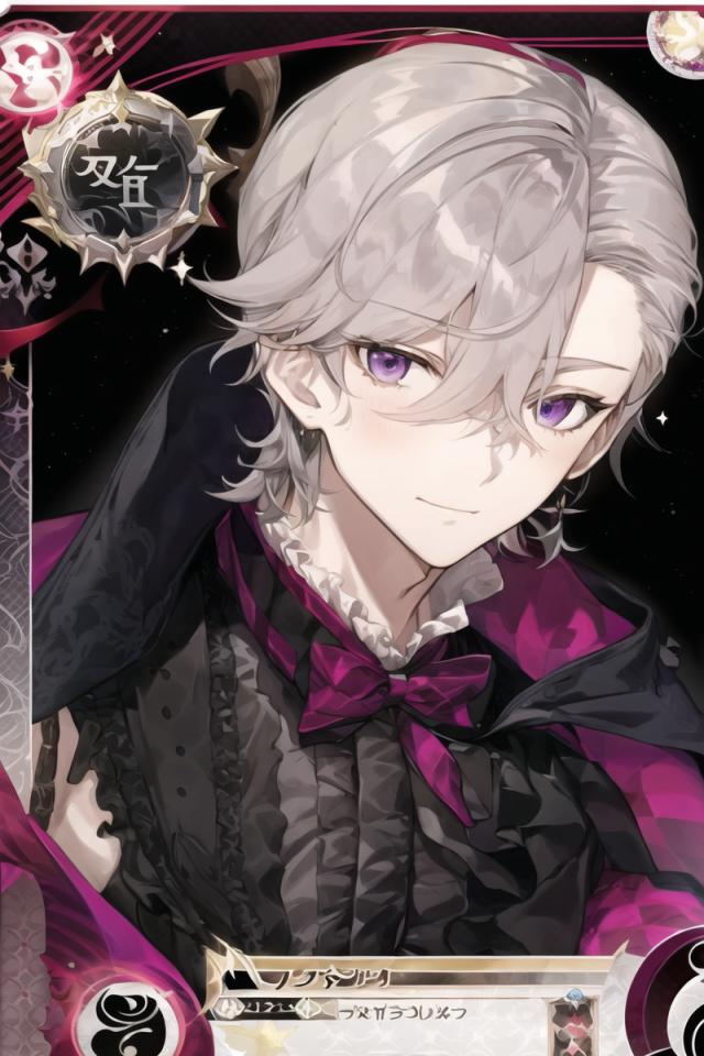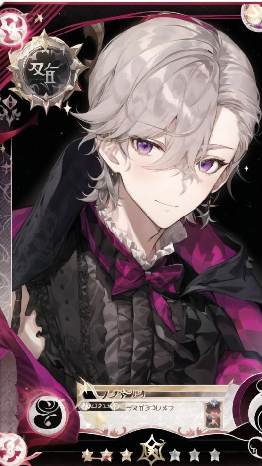 1boy, bangs, black shirt, bow, bowtie, cape, center frills , closed mouth, frills, grey hair, hair between eyes, looking at viewer, male focus, purple bow, purple eyes, shirt, short hair, smile, solo, upper body