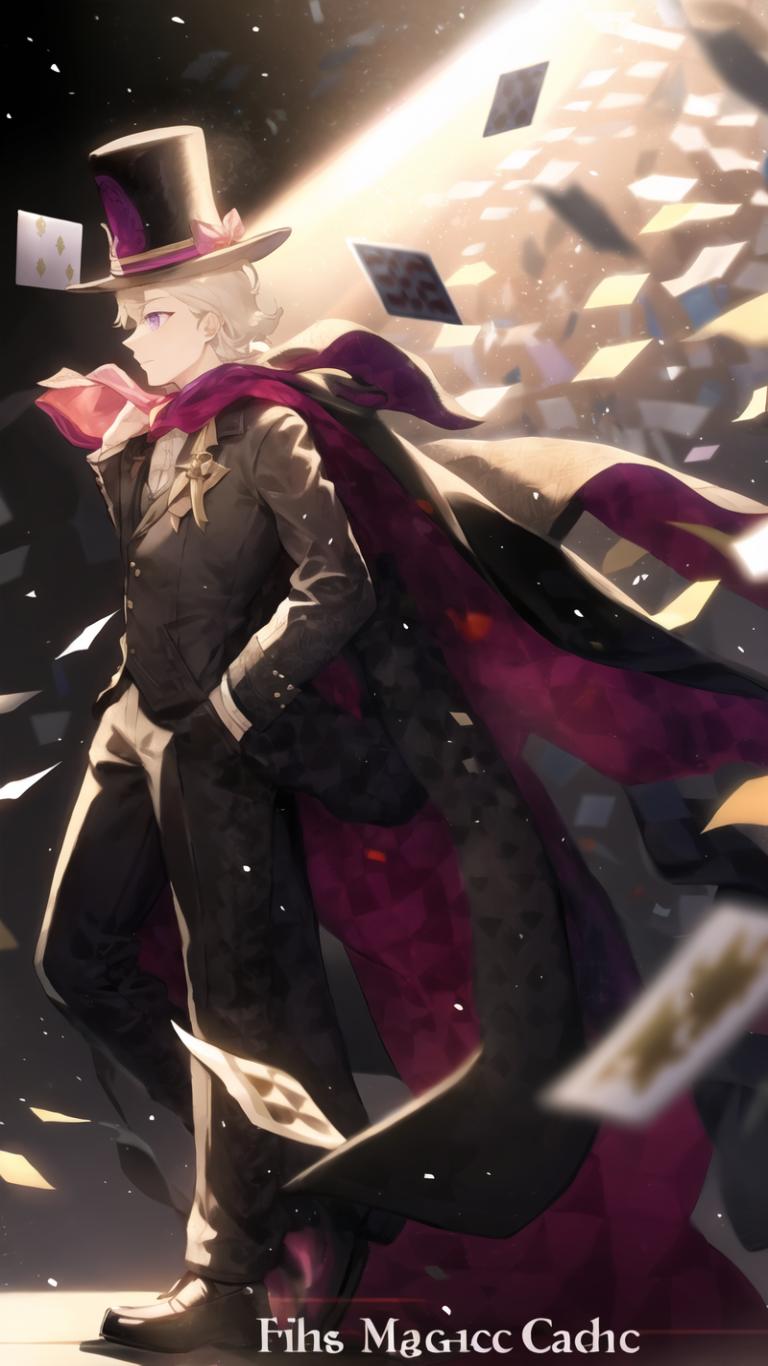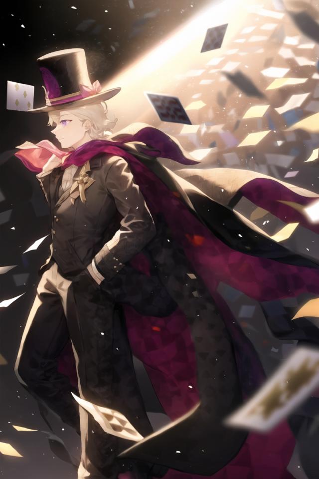 1boy, black footwear, black headwear, black jacket, black pants, cape, card, formal, from side, full body, hand in pocket, hands in pockets, hat, jacket, long sleeves, male focus, pants, purple eyes, purple scarf , scarf, shirt, short hair, solo, standing, suit, top hat, white hair