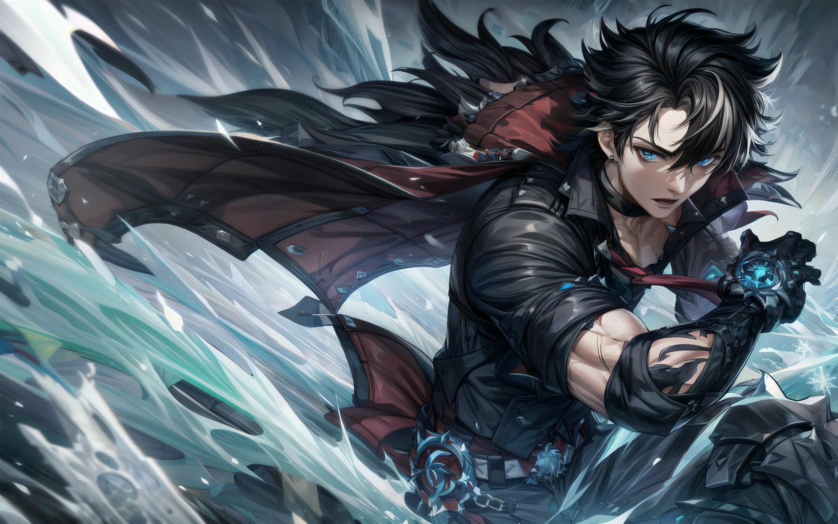 1boy, belt, black gloves, black hair, black shirt, blue eyes, choker, fighting stance , flower, gauntlets, gloves, hair between eyes, jacket, looking at viewer, male focus, muscular, muscular male, necktie, open mouth, scar, scar on face, shirt, sleeves rolled up, solo, veins