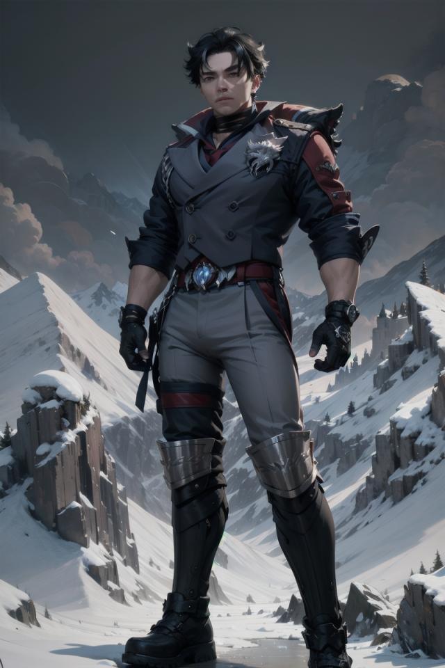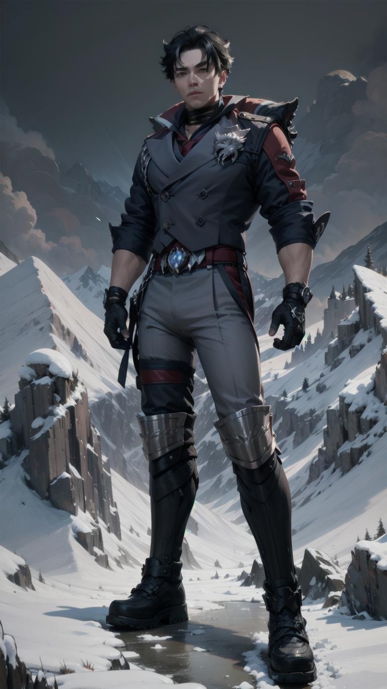 1boy, armor, belt, black footwear, black gloves, black hair, boots, closed mouth, cloud, cloudy sky, full body, gloves, grey sky , jacket, male focus, mountain, outdoors, pants, rock, scar, shirt, short hair, sky, sleeves rolled up, snow, solo, standing, thigh strap