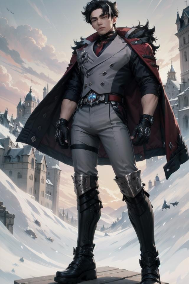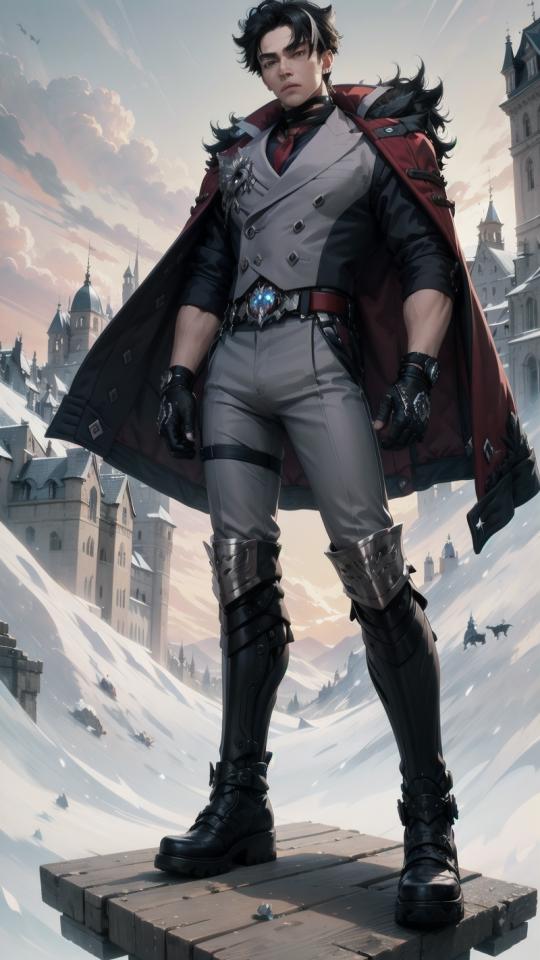 1boy, belt, bird, black belt, black footwear, black gloves, black hair, black shirt, boots, buckle, building, buttons, closed mouth, cloud, cloudy sky, coat, coat on shoulders , collared shirt, ear piercing, earrings, facial hair, full body, fur trim, fur-trimmed coat, gloves, grey pants, jacket, jewelry, looking at viewer, male focus, necktie, outdoors, pants, piercing, red shirt, scar, shirt, short hair, sky, solo, standing