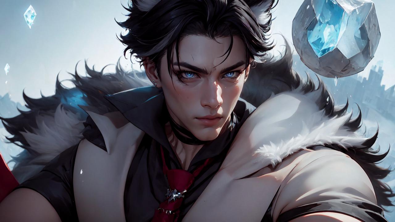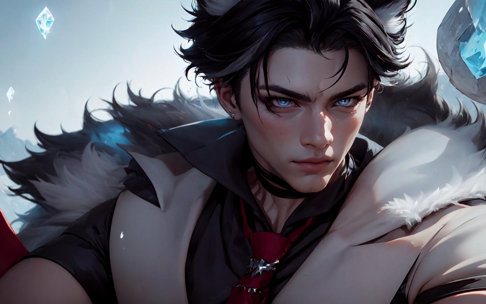 1boy, bangs, black choker, black hair, black shirt, blue eyes, choker, closed mouth, coat, collared shirt, cube, diamond (gemstone) , earrings, fur trim, fur-trimmed coat, gem, jewelry, looking at viewer, male focus, necktie, red necktie, shirt, short hair, solo, upper body