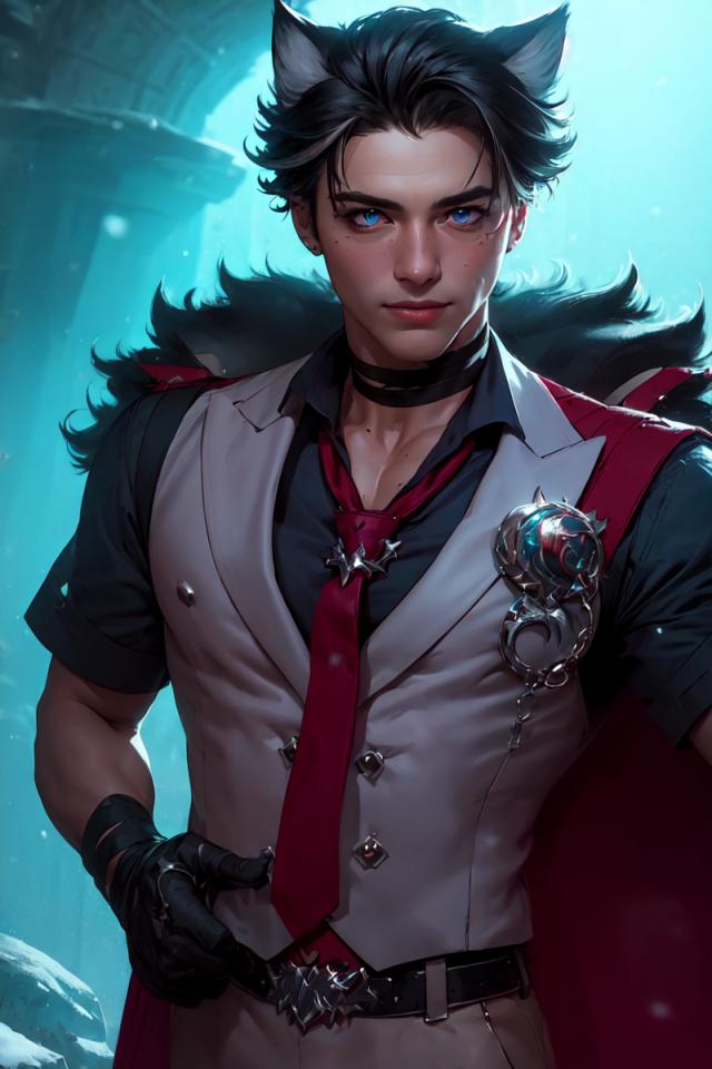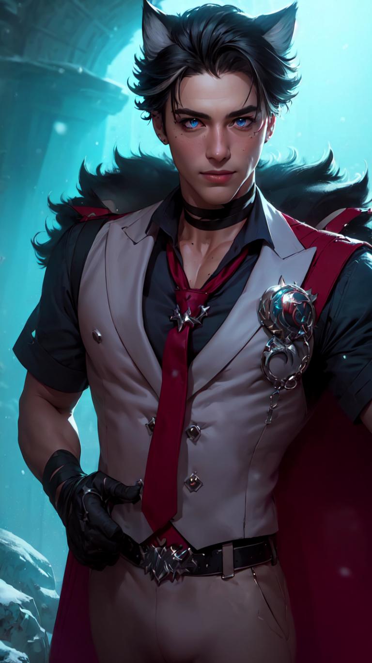 1boy, animal ears, belt, black belt, black choker, black gloves, black hair, black shirt, blue eyes, cat ears, choker, closed mouth, collared shirt, earrings, freckles, genderswap, gloves, jewelry, looking at viewer, male focus, mole, mole on neck , mole under eye, necktie, pants, piercing, red necktie, shirt, short hair, short sleeves, solo, vest, white vest