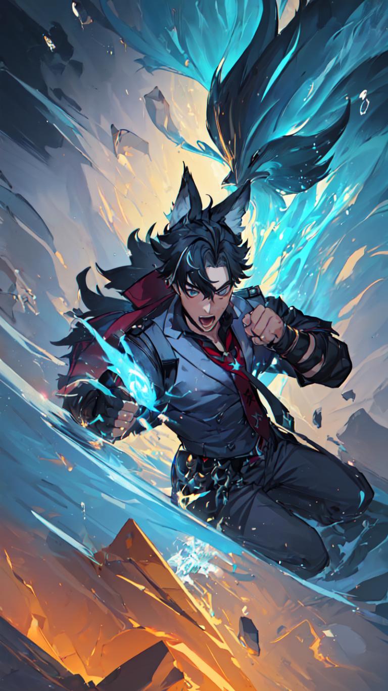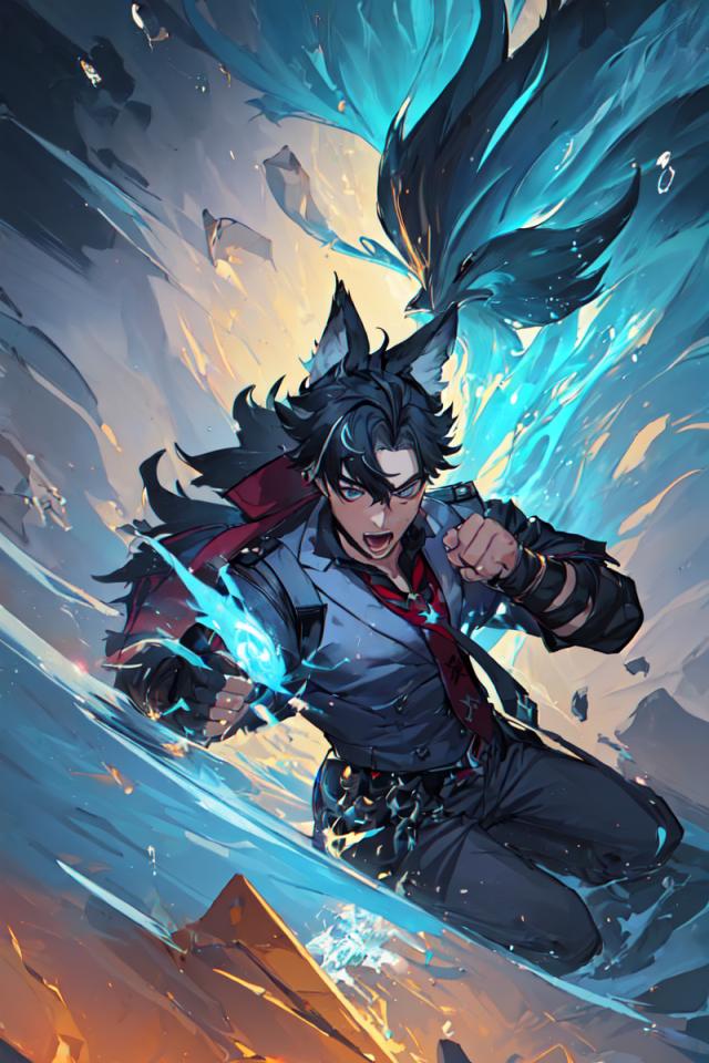 1boy, animal ears, belt, black gloves, black hair, black pants, blue eyes, collared shirt, fingerless gloves, gloves, hair between eyes, jacket, long hair, looking at viewer, male focus, necktie, official alternate costume, open mouth, pants, red necktie, red shirt , shirt, smile, solo, water