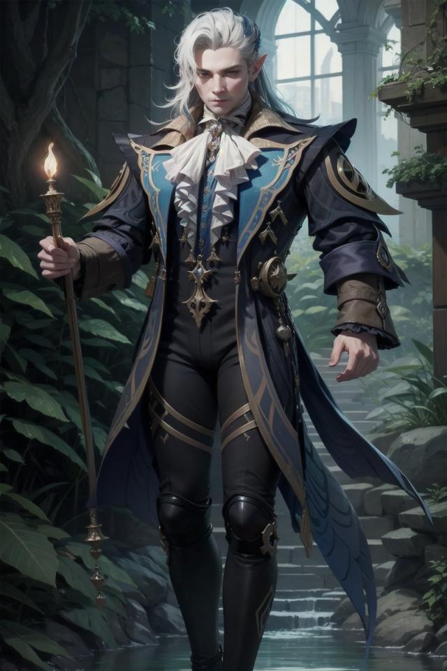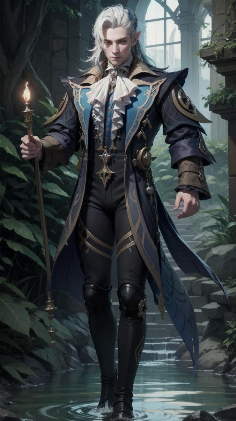 1boy, ascot, black footwear, black pants, boots, candle, full body, holding, long hair, long sleeves, looking at viewer, male focus, pants, pointy ears, solo, staff, standing, water, white ascot , white hair