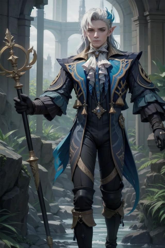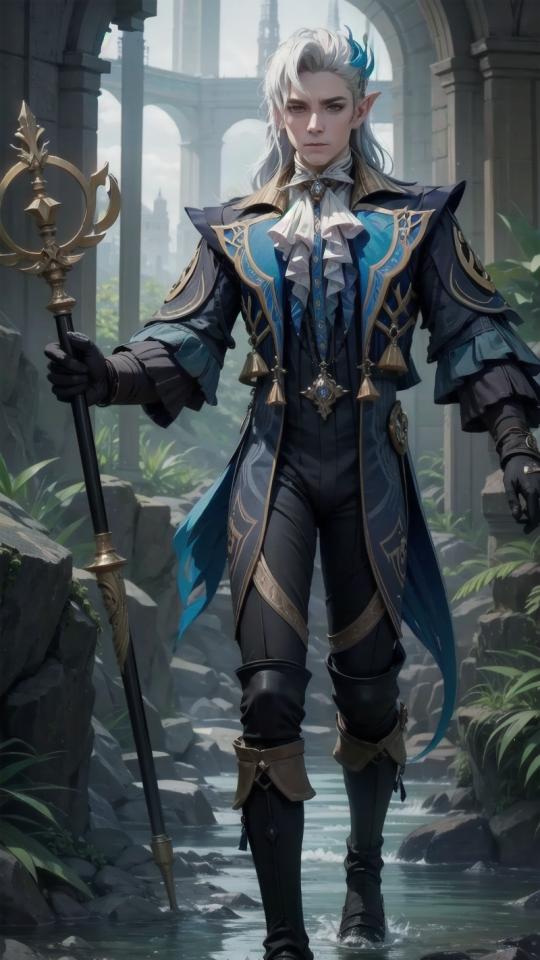 1boy, ascot, black footwear, black gloves, black pants, boots, frills, full body, gloves, holding, holding staff, long hair, looking at viewer, male focus, outdoors, pants, plant, pointy ears, rock, ruins, solo, staff, standing, water, weapon, white ascot , white hair