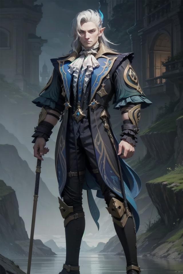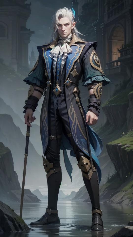 1boy, ascot, black footwear, black pants, boots, cane, closed mouth, full body, holding, holding cane , long hair, looking at viewer, male focus, outdoors, pants, pointy ears, solo, standing, water, weapon, white ascot, white hair