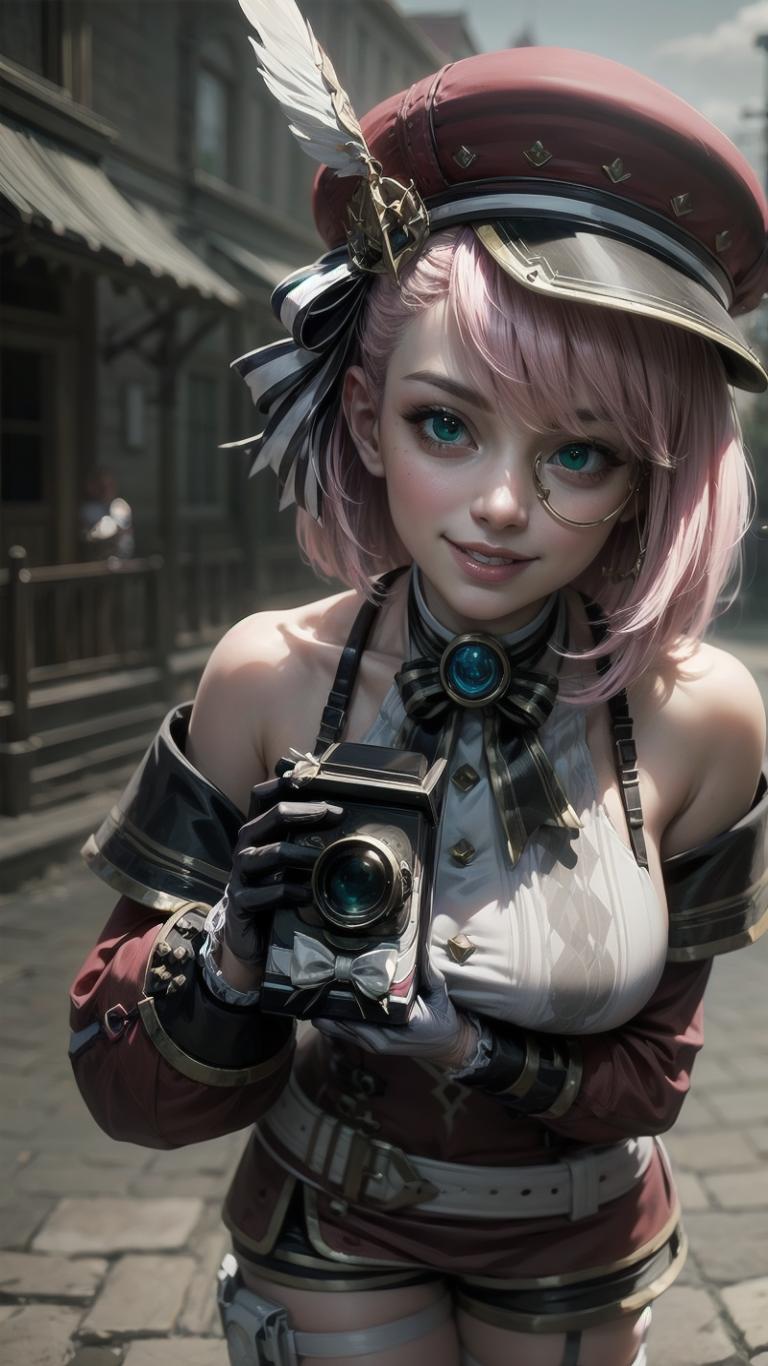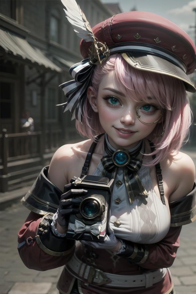 1girl, aqua eyes, bangs, bare shoulders, belt, black gloves, blurry, blurry background, bow, bowtie, camera, collarbone, cowboy shot, day, depth of field, detached sleeves, garter straps, glasses, gloves, green eyes, hat, hat feather, holding, holding camera , jacket, jewelry, large breasts, long sleeves, looking at viewer, medium hair, off shoulder, outdoors, parted lips, pink hair, red headwear, red shorts, ribbon, round eyewear, see-through, shirt, short hair, short shorts, shorts, sleeveless, sleeveless shirt, smile, solo, standing, striped, thigh strap, thighhighs, white gloves, white shirt