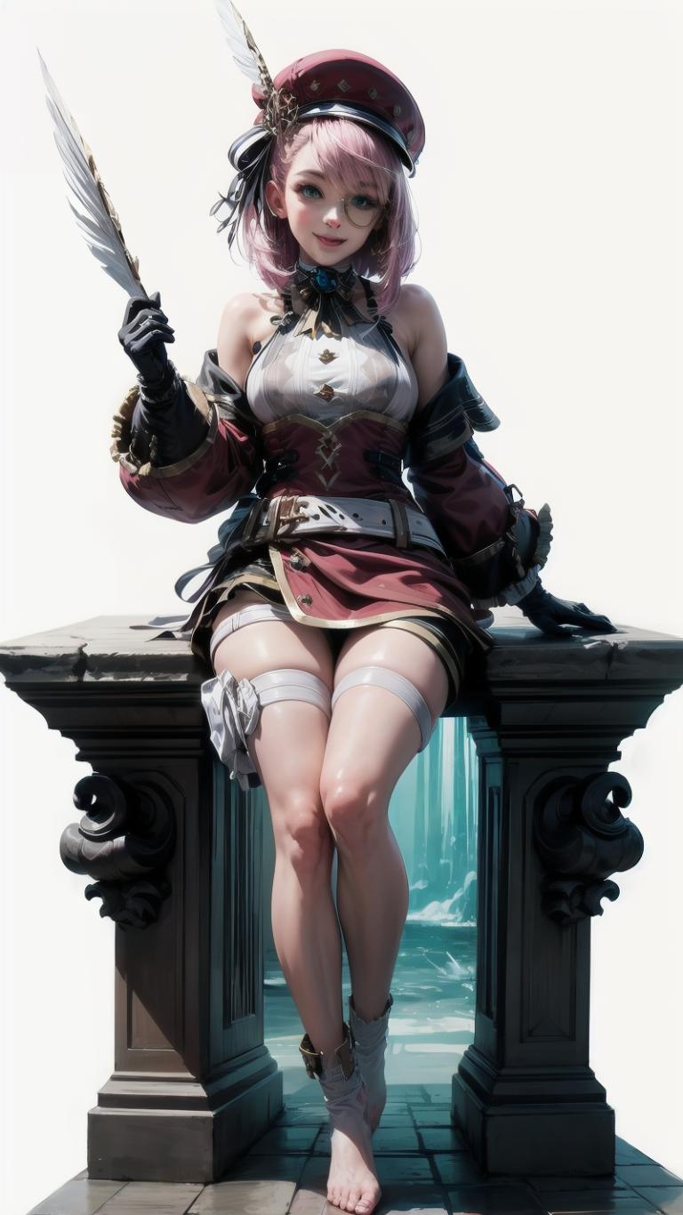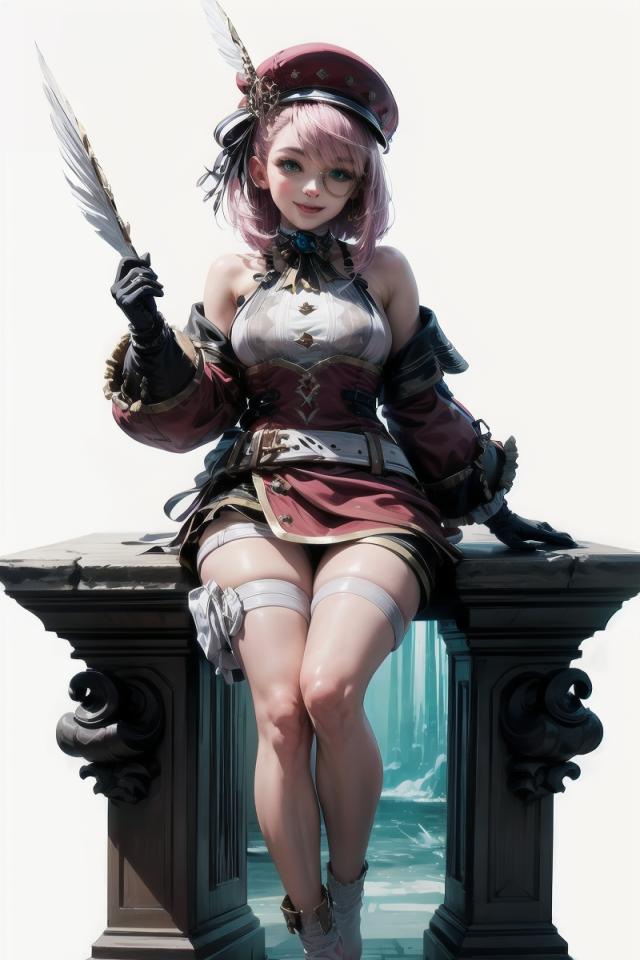 1girl, arm support, ascot, bangs, bare shoulders, barefoot, belt, belt pouch, beret, black gloves, braid, dress, earrings, feathers, feet, full body, glasses, gloves, green eyes, hand up, hat, hat feather, holding, jacket, jewelry, long sleeves, looking at viewer, medium breasts, medium hair, monocle, off shoulder, open clothes, open jacket, pink hair, pouch, quill , red headwear, ribbon, round eyewear, shirt, simple background, sitting, skirt, sleeveless, sleeveless shirt, smile, solo, swept bangs, thigh strap, toeless legwear, toenails, toes, white background