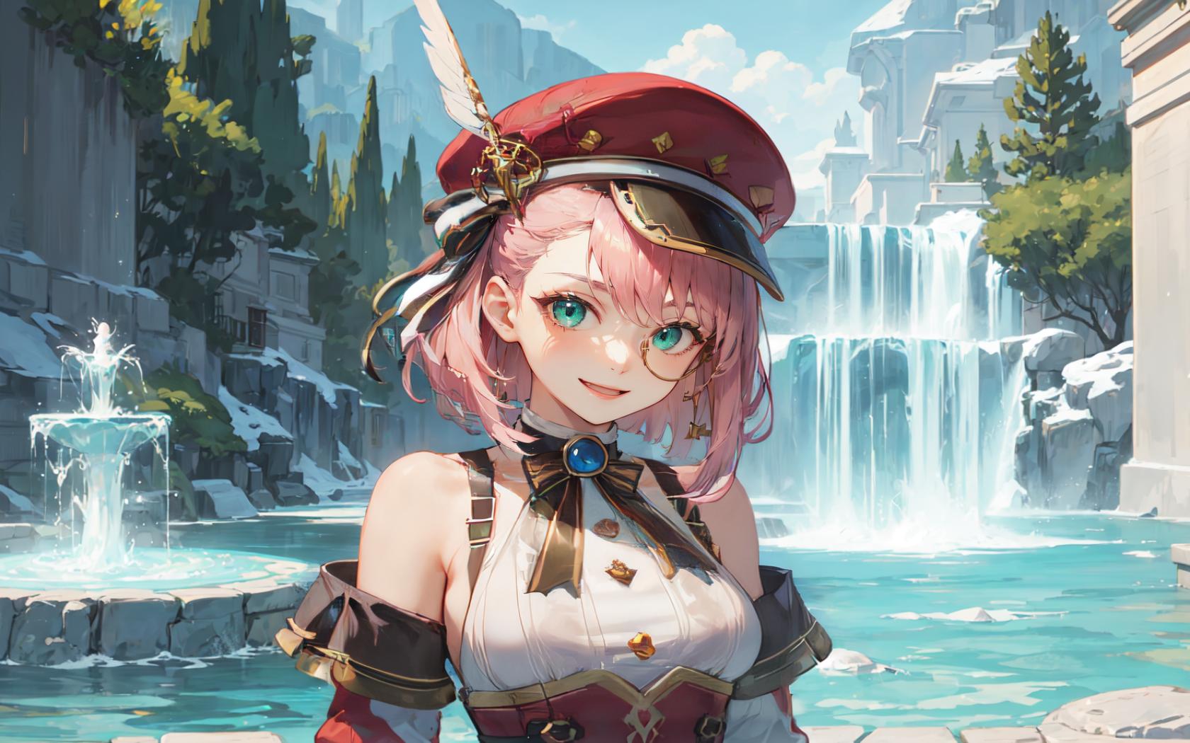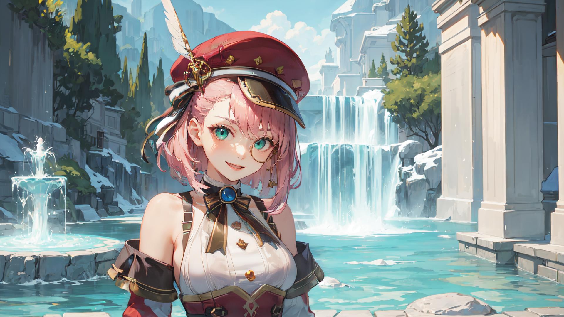 1girl, :d, aqua eyes, bangs, bare shoulders, beret, blue sky, bow, bowtie, building, cloud, day, detached sleeves, earrings, feathers, fountain , hat, hat feather, jewelry, looking at viewer, medium breasts, monocle, open mouth, outdoors, pink hair, red headwear, shirt, short hair, sky, sleeveless, sleeveless shirt, smile, solo, underbust, upper body, water, waterfall, white shirt