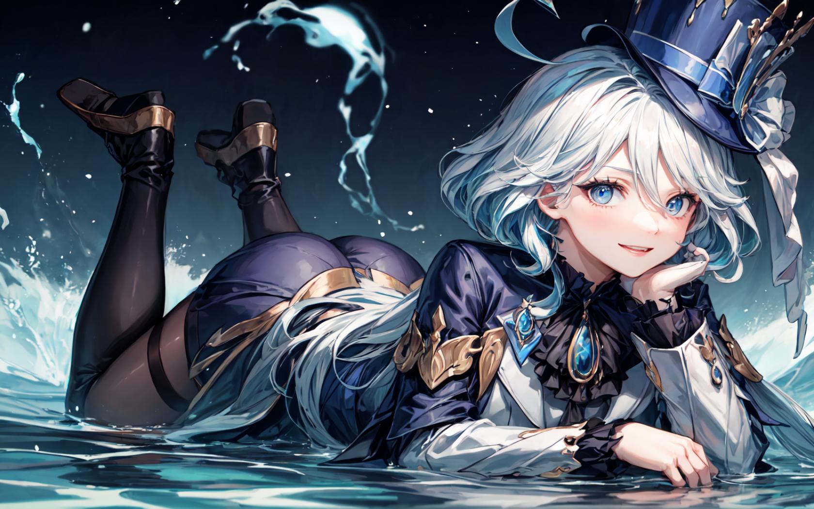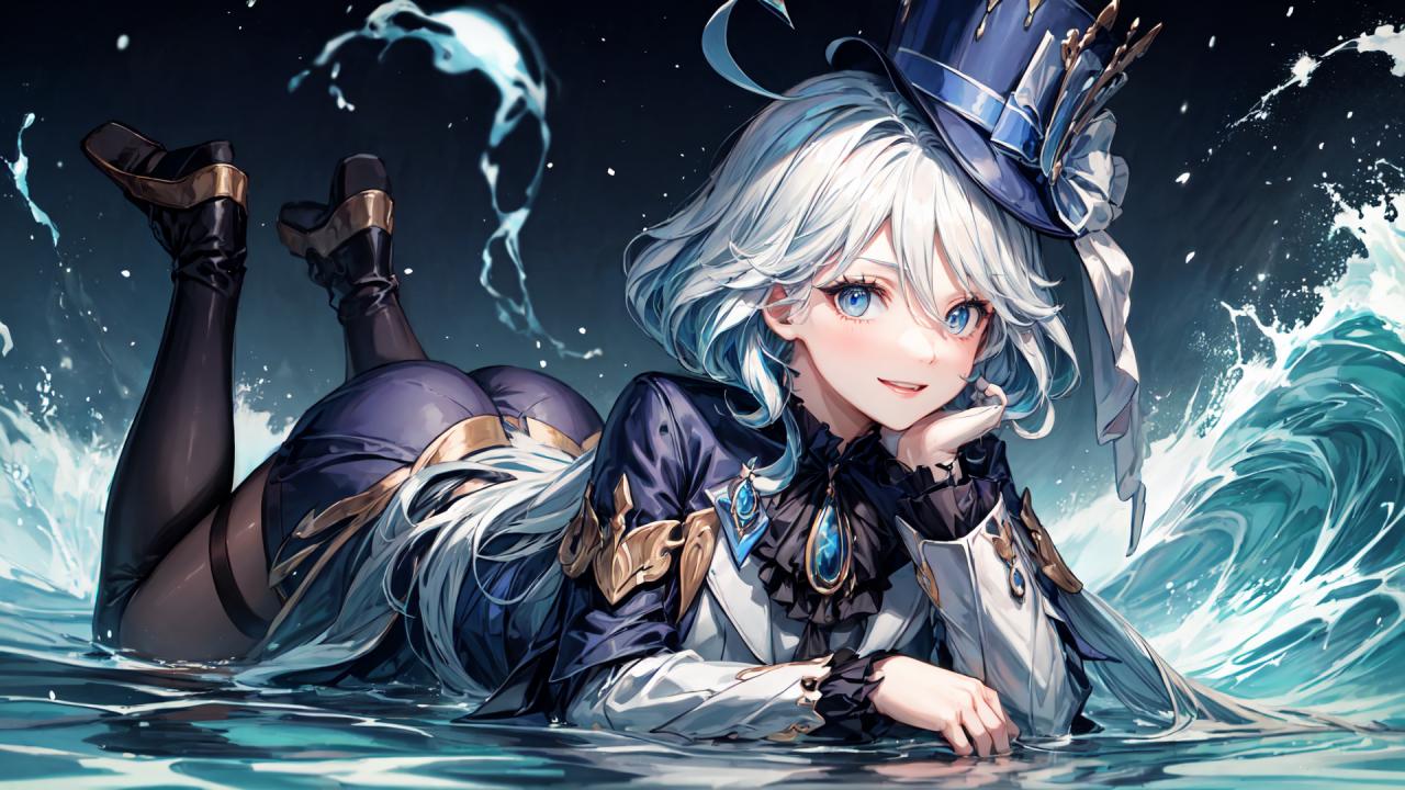 1girl, ahoge, ass, bangs, black footwear, black pantyhose, blue eyes, blue gemstone , blue hair, blue headwear, blue shorts, boots, brooch, earrings, feet up, full body, gem, hair between eyes, hat, head rest, high heels, jewelry, legs up, long hair, long sleeves, looking at viewer, lying, on stomach, pantyhose, parted lips, shirt, shorts, smile, solo, the pose, top hat, water, white hair, white shirt