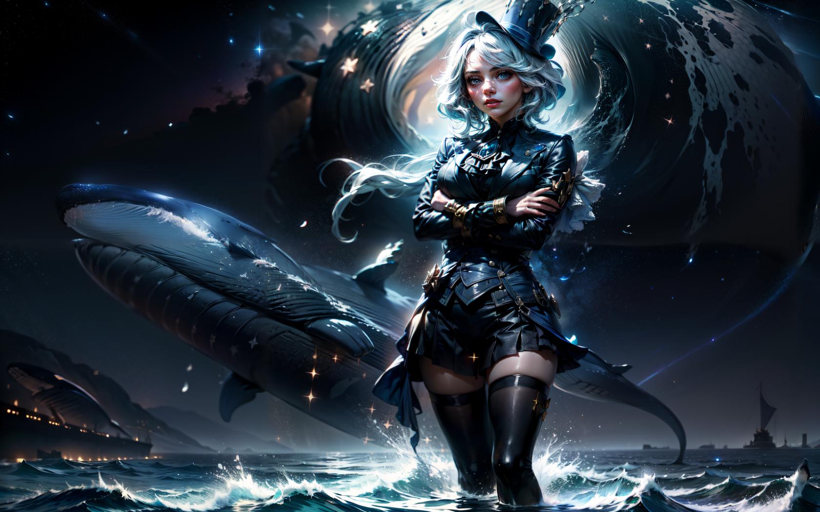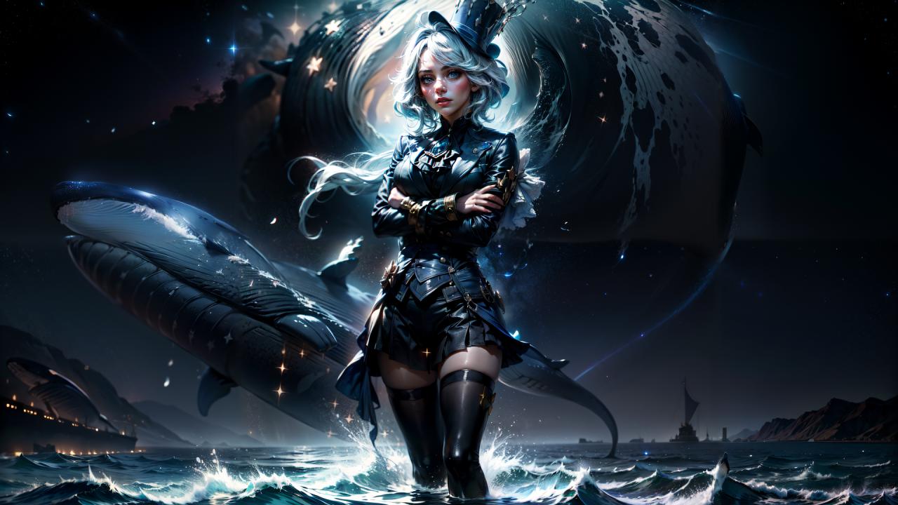 1girl, black thighhighs, blue eyes, crossed arms, hat, long hair, night, night sky, ocean, ship , skirt, sky, solo, star (sky), thighhighs, top hat, water, watercraft, white hair