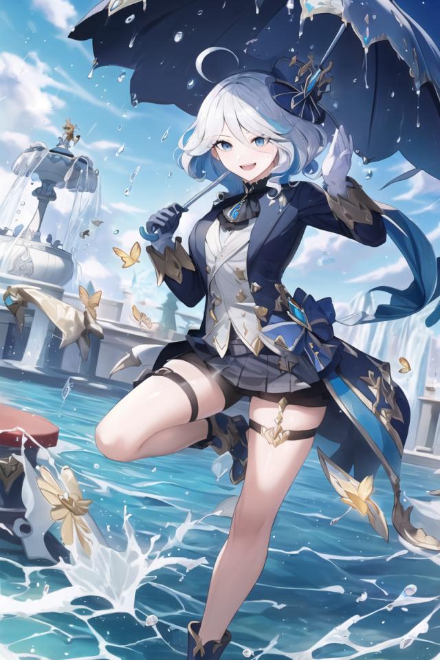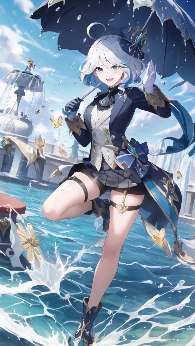 1girl, :d, ahoge, bangs, bike shorts, black footwear, black jacket, black shorts, blue butterfly , blue eyes, blue hair, blue jacket, blue sky, boots, bow, bug, butterfly, cloud, cloudy sky, full body, gloves, grey skirt, hair between eyes, hat, holding, holding umbrella, jacket, long sleeves, looking at viewer, multicolored hair, open mouth, outdoors, pleated skirt, shirt, short hair, shorts, shorts under skirt, skirt, sky, smile, solo, standing, standing on one leg, thigh strap, umbrella, water, white gloves, white hair, white shirt