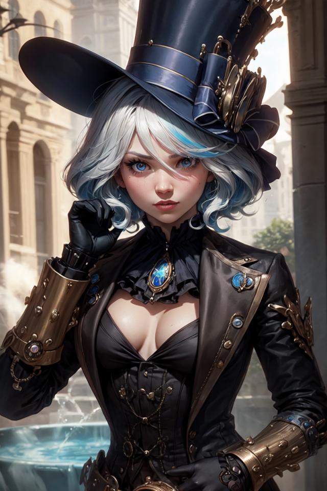 1girl, ascot, belt, black gloves, black headwear, black jacket, blue eyes, blue hair, brooch, cleavage, earrings, gloves, hat, holding, jacket, jewelry, long sleeves, looking at viewer, medium breasts, mole, multicolored hair, outdoors, pocket watch, short hair, solo, steampunk , streaked hair, top hat, watch, water, white hair