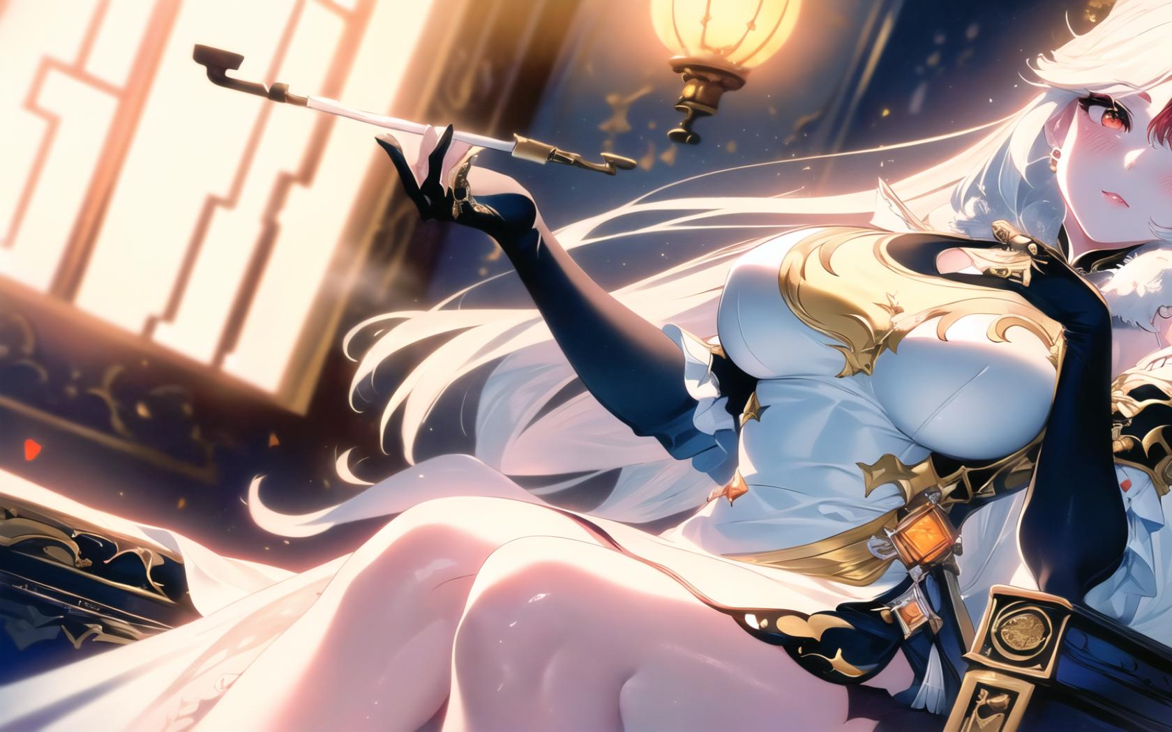 1girl, bangs, bare shoulders, black gloves, blush, china dress, chinese clothes, claw ring , dress, dutch angle, elbow gloves, fur collar, fur trim, gloves, hair ornament, hair stick, hairpin, hand on own chest, holding, holding smoking pipe, indoors, jewelry, kiseru, lantern, large breasts, long hair, looking at viewer, parted bangs, parted lips, red eyes, sidelocks, sitting, smile, smoke, smoking pipe, solo, tassel, very long hair, white dress, white hair