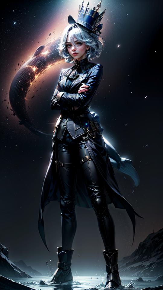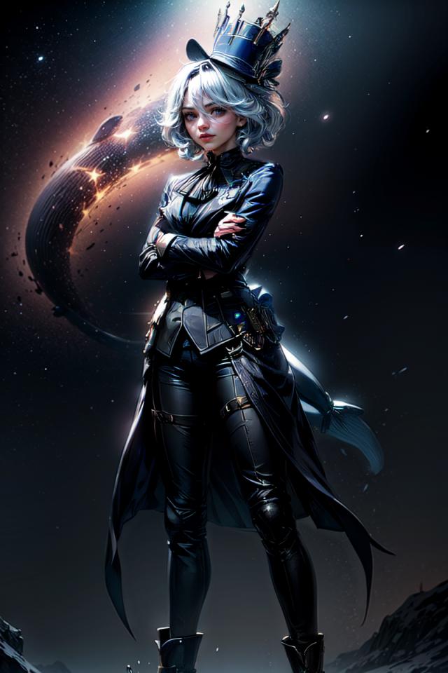 female character character with her arms crossed dressed in futuristic style, on the planet, in a fantasy space setting, on a black background