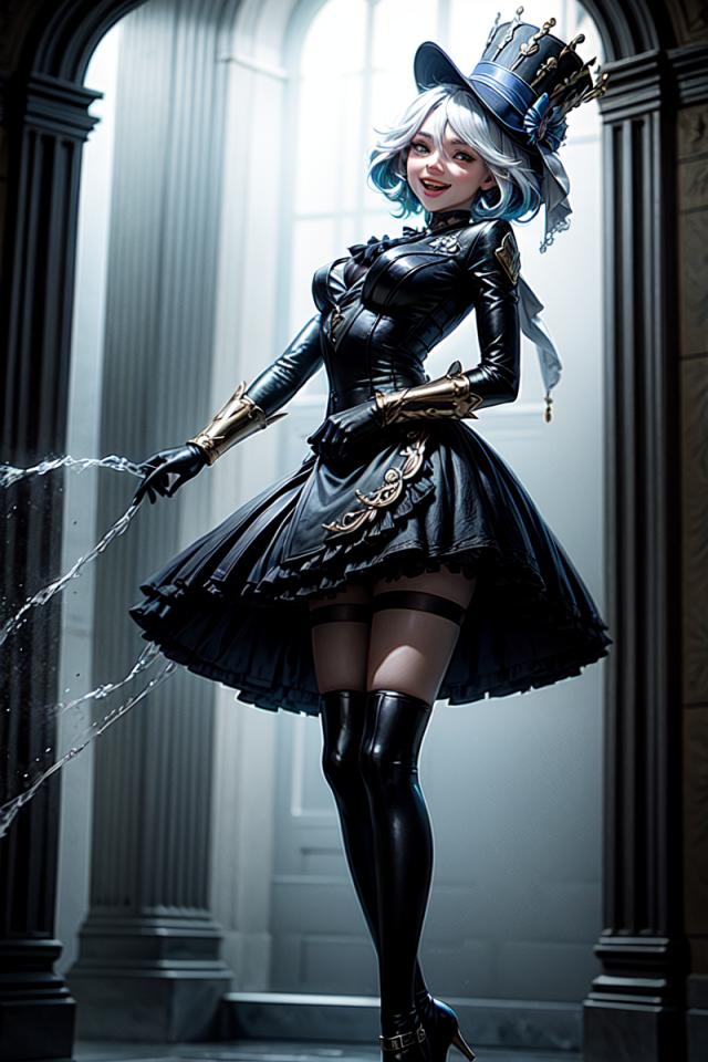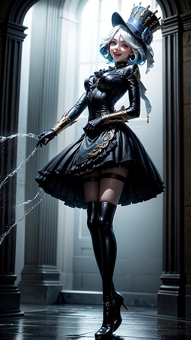 1girl, black dress, black footwear, black gloves, black headwear, boots, chain, dress, earrings, full body, gloves, hat, high heel boots, high heels, holding, indoors, jewelry, latex , leather, lipstick, looking at viewer, makeup, medium breasts, pantyhose, red lips, shiny clothes, short hair, smile, solo, standing, thigh boots, thighhighs, top hat, white hair