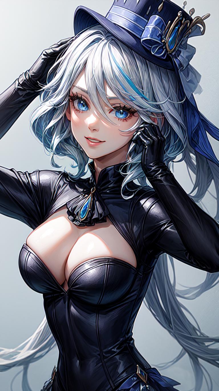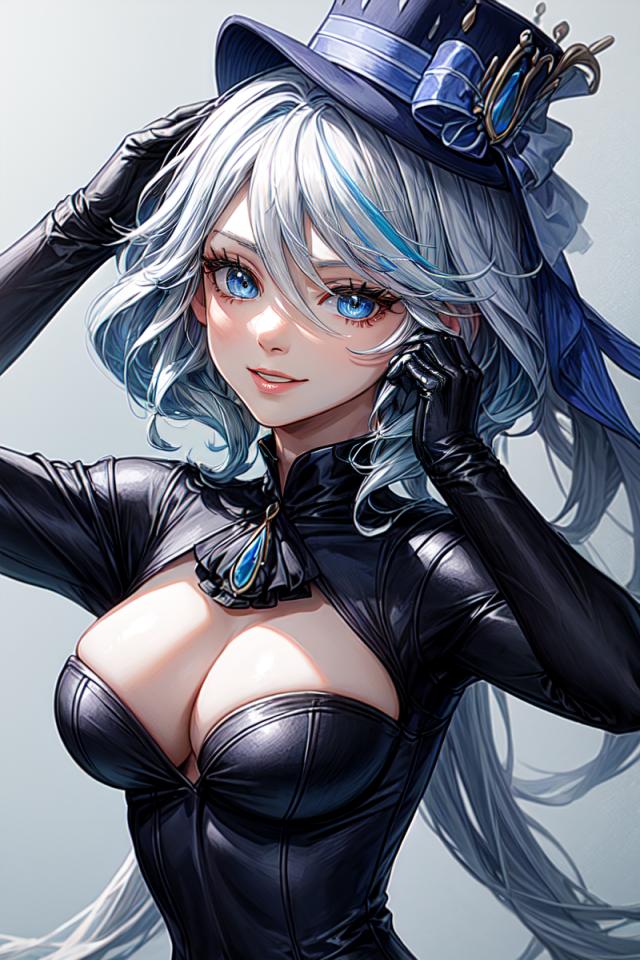 1girl, bangs, black gloves, black headwear, blue eyes, blue hair, bow, brooch, cleavage, cleavage cutout, clothing cutout, covered navel, elbow gloves, eyelashes, gem, gloves, gradient, gradient background, grey background, hair between eyes, hand on headwear, hat, hat bow, jewelry, large breasts, long hair, long sleeves, looking at viewer, medium breasts, multicolored hair, parted lips, shrug (clothing) , simple background, smile, solo, streaked hair, top hat, upper body, white hair