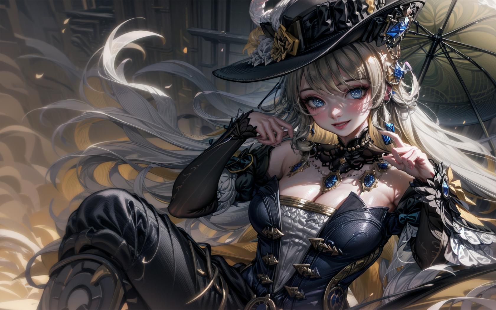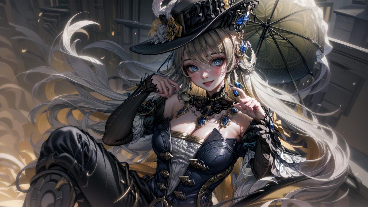 the beautiful young woman is wearing elaborate clothes and holding an umbrella, holding a pipe, a large chain with three tiny hands and a black lace