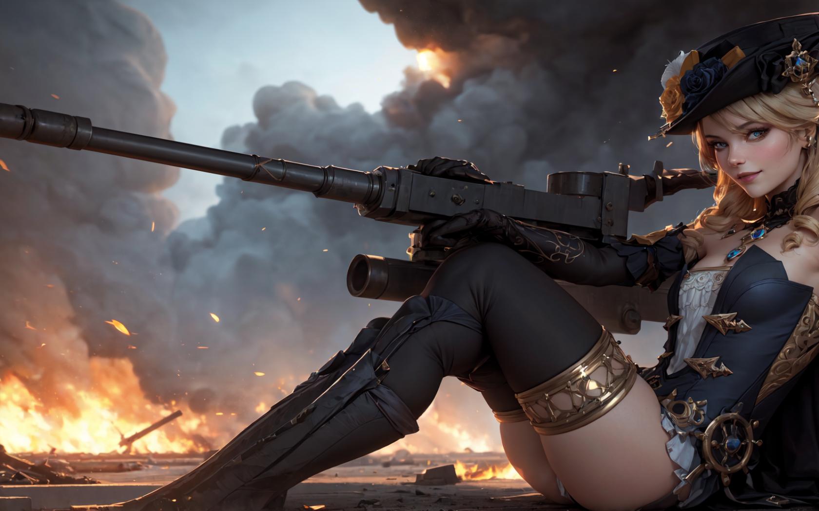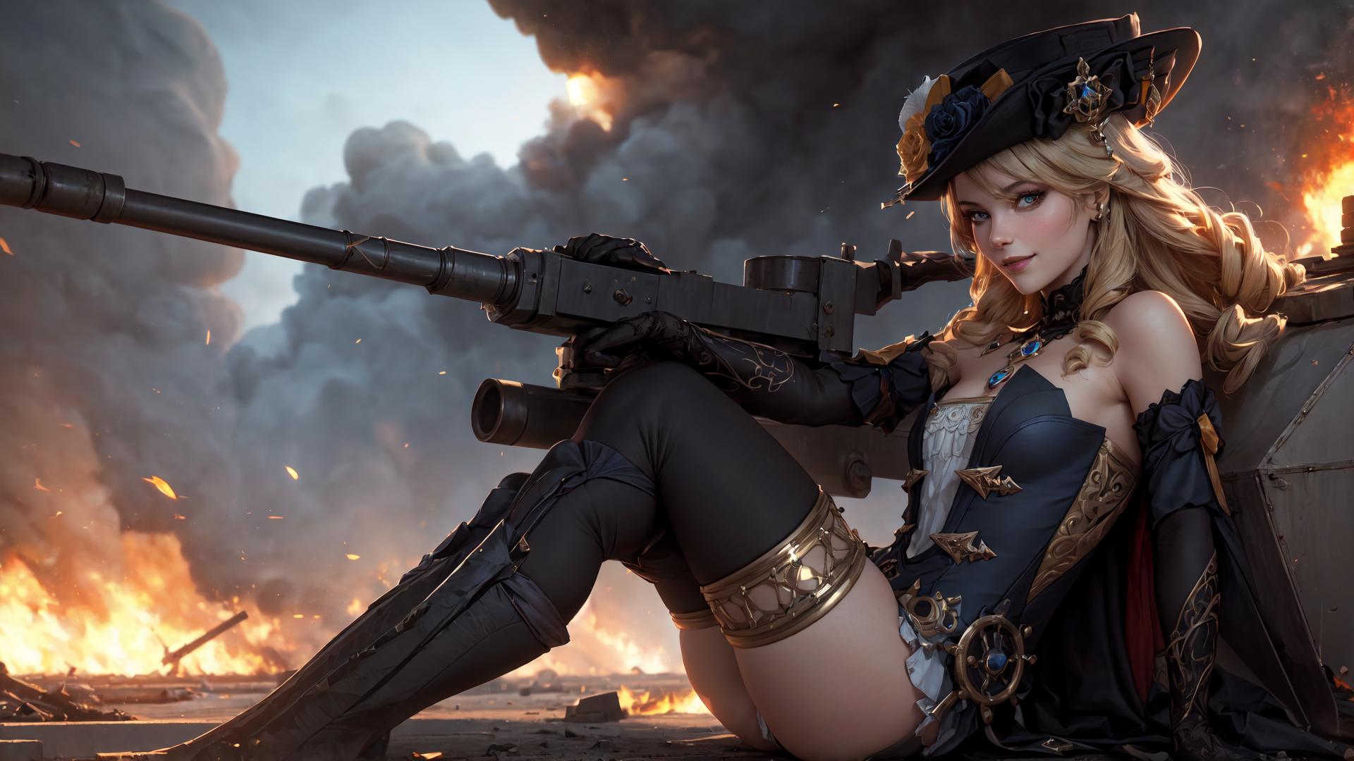 1girl, arm support, bare shoulders, black gloves, black headwear, black thighhighs, blonde hair, blue eyes, blue rose, boots, braid, cleavage, cross-laced footwear, crossed legs, drill hair, elbow gloves, fire, flower, gloves, ground vehicle, gun, hat, hat flower, holding, holding gun, holding weapon, jewelry, knee boots, long hair, looking at viewer, medium breasts, necklace, outdoors, rifle, rose, sitting, smoke, solo, steampunk , thighhighs, twin braids, weapon