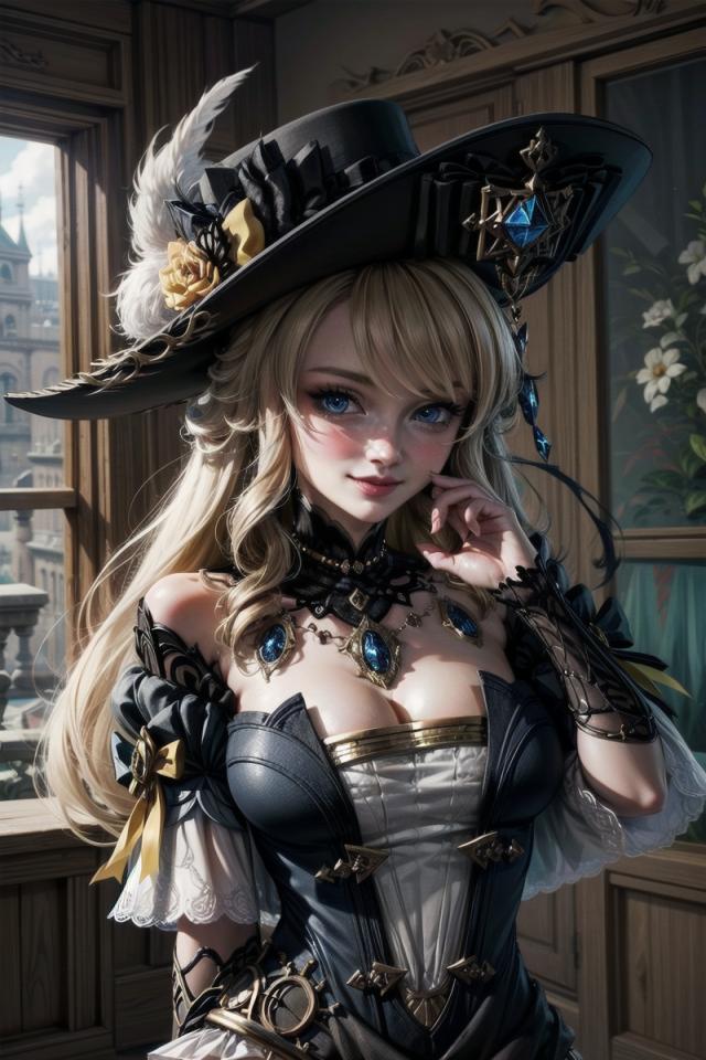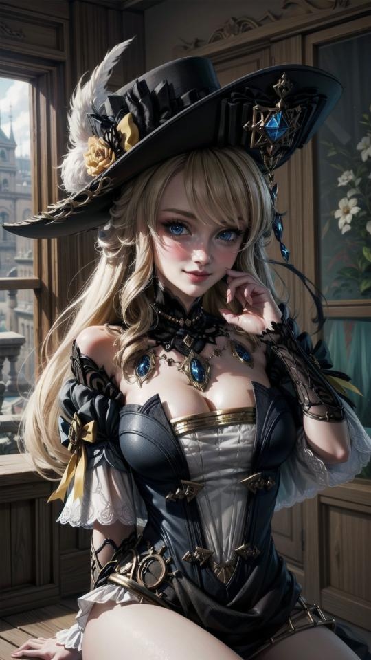 this is a pretty steam powered couture doll in a hat and bra top by a window with potted plants on them and candles