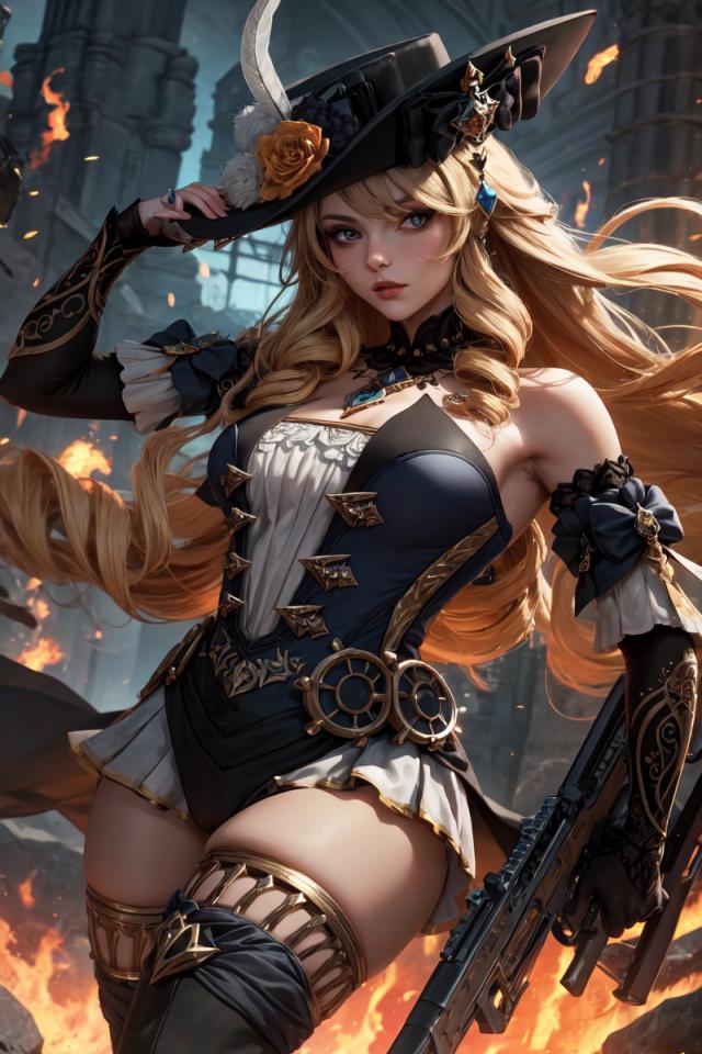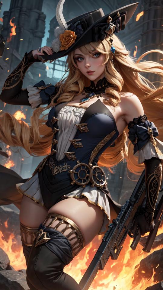 1girl, bare shoulders, black gloves, black headwear, black thighhighs, blonde hair, blue eyes, boots, cleavage, curly hair, detached collar, detached sleeves, drill hair, fire, flower, frills, gloves, gun, hat, hat feather , hat flower, holding, holding gun, holding weapon, jewelry, large breasts, long hair, looking at viewer, medium breasts, rifle, skindentation, skirt, solo, thigh boots, thighhighs, weapon