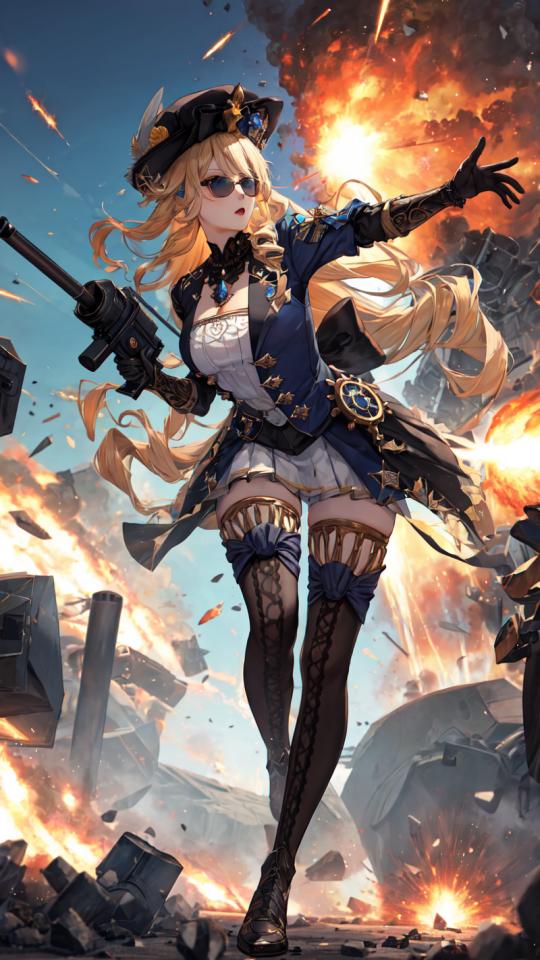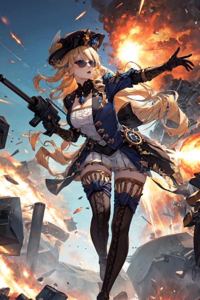 1girl, bangs, black footwear, black gloves, black headwear, blonde hair, blue eyes, boots, bow, cleavage, dress, drill hair, explosion, fire, firing , full body, gloves, ground vehicle, gun, hat, holding, holding gun, holding weapon, jacket, jewelry, large breasts, long hair, medium breasts, military, motor vehicle, open mouth, outdoors, outstretched arm, pleated skirt, skirt, sky, smoke, solo, standing, striped, sunglasses, thigh boots, thighhighs, very long hair, weapon, zettai ryouiki