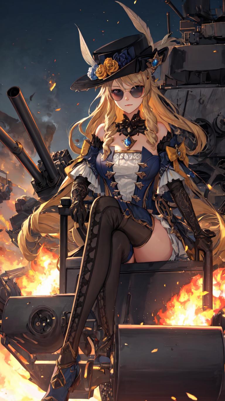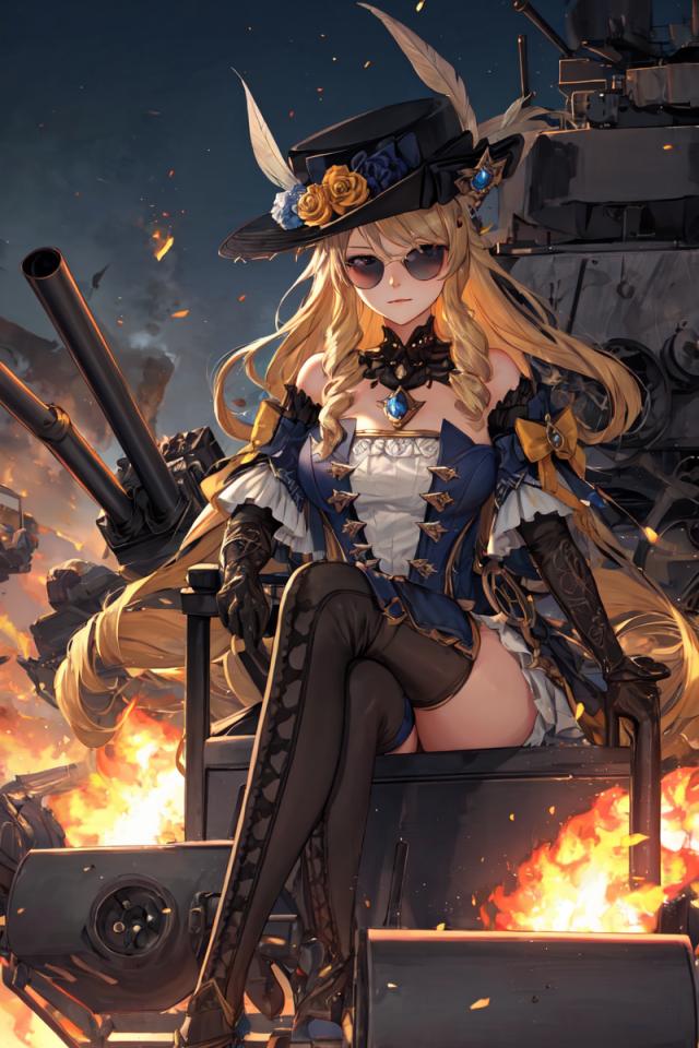 1girl, bare shoulders, black gloves, black headwear, black thighhighs, blonde hair, blue dress, blue eyes, blue rose, boots, brooch, cannon, cleavage, cross-laced footwear, crossed legs, dress, drill hair, elbow gloves, feathers, fire, flower, frills, gloves, hat, hat feather , hat flower, high heel boots, high heels, jewelry, long hair, looking at viewer, medium breasts, necklace, rose, sitting, solo, sunglasses, thigh boots, thighhighs, top hat, turret, very long hair