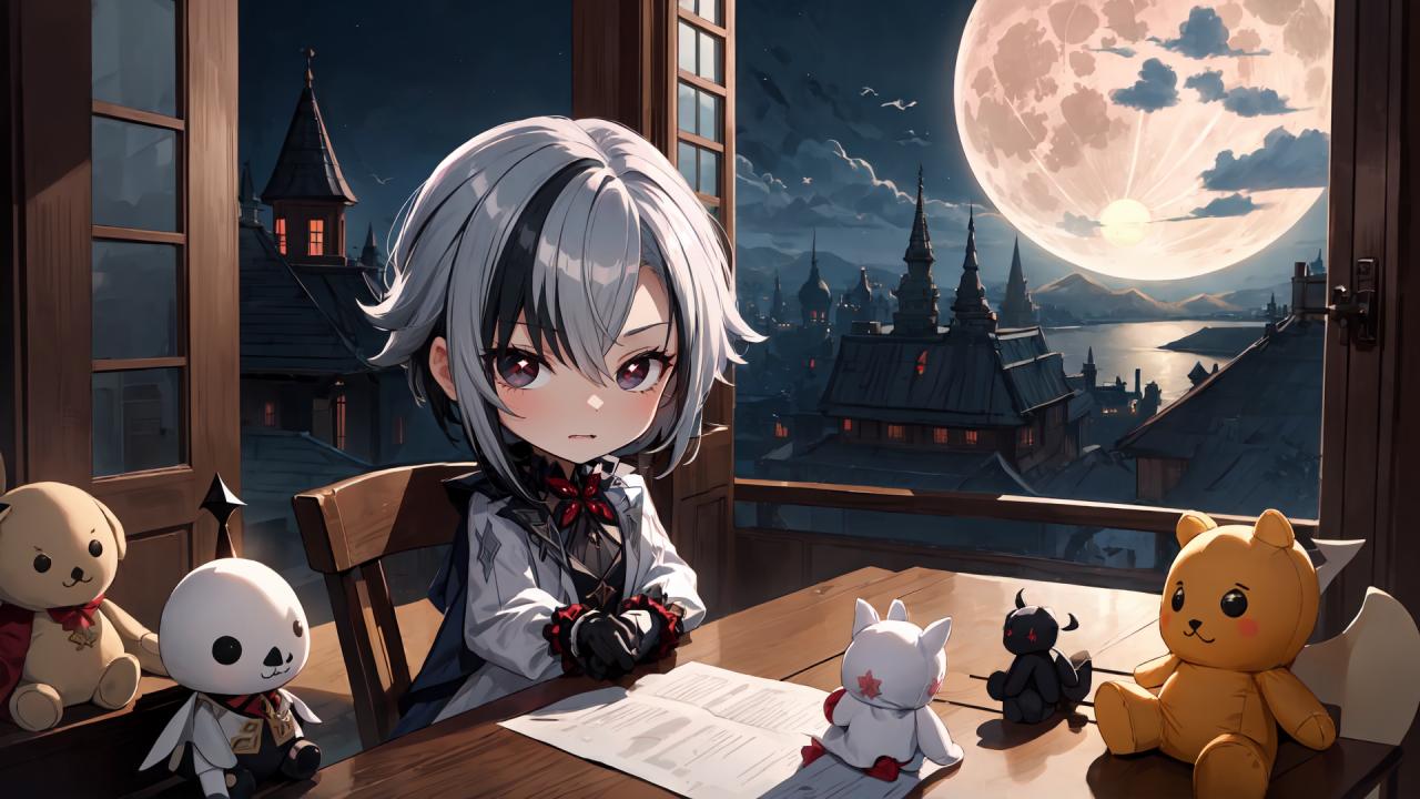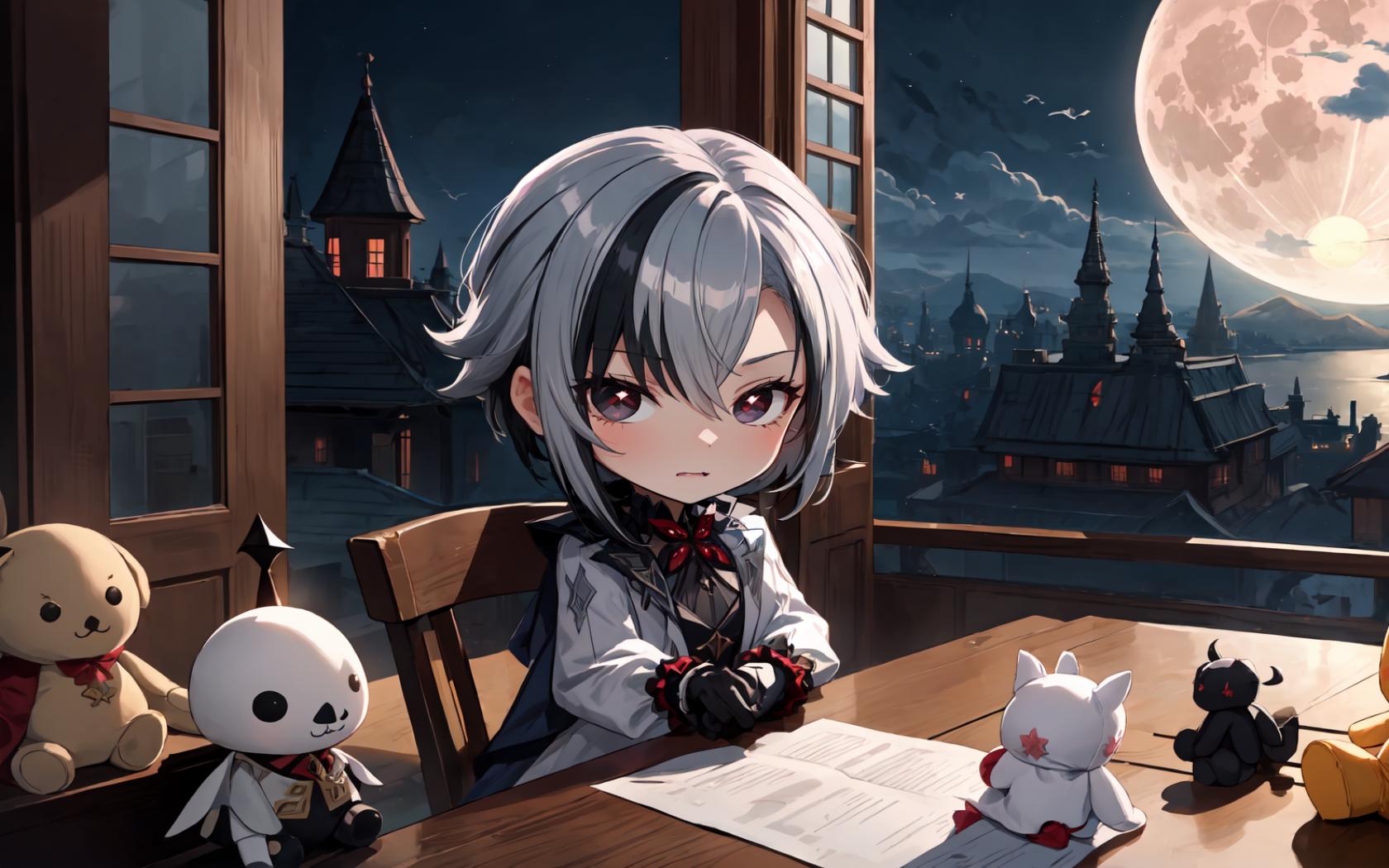 1girl, bangs, black eyes, black gloves, black hair, blush, chibi, closed mouth, cloud, coat, full moon, fur trim, fur-trimmed coat, gloves, grey hair, hair between eyes, indoors, long sleeves, looking at viewer, moon, multicolored hair, night, night sky, paper, short hair, sitting, sky, solo, streaked hair, stuffed animal, stuffed bunny, stuffed cat, stuffed toy, symbol-shaped pupils, teddy bear, white coat, white hair, window, x-shaped pupils