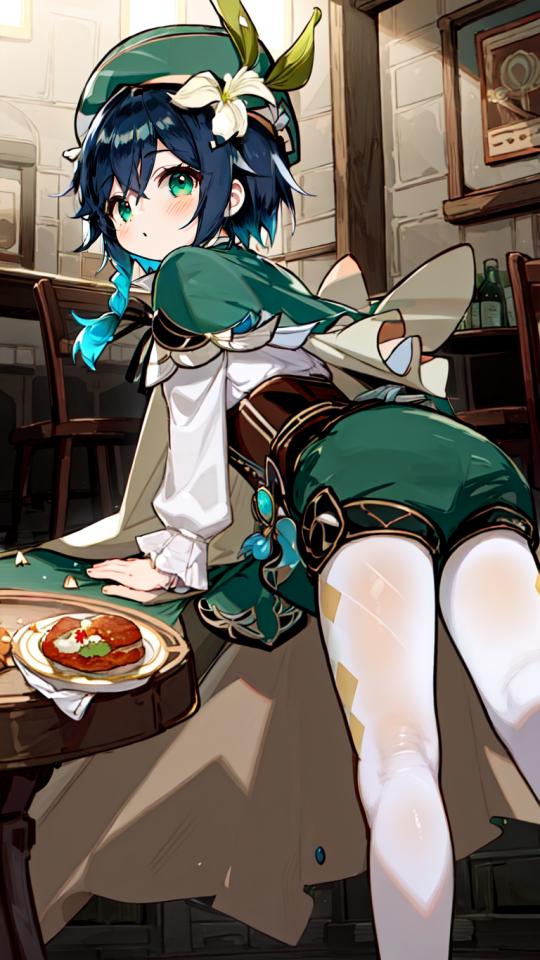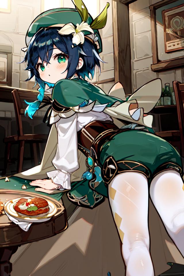 | Prompt | <lora:venti:1>1boy, male focus, venti (genshin impact), black hair, hat, braid, long sleeves, twin braids, gradient hair, multicolored hair, pantyhose, vision (genshin impact), bow, shorts, green headwear, beret, white pantyhose, green shorts, collared cape, bangs, butterfly, white flower, shirt, jewelry, looking at viewer, white shirt, brooch, cape, androgynous, frilled sleeves, frills, leaf, corset, short hair with long locks,
