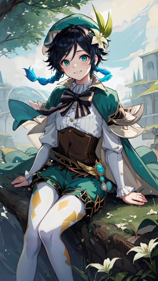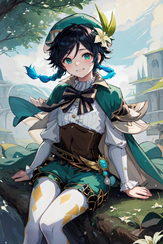 | Prompt | <lora:venti:1>1boy, male focus, venti (genshin impact), black hair, hat, braid, long sleeves, twin braids, gradient hair, multicolored hair, pantyhose, vision (genshin impact), bow, shorts, green headwear, beret, white pantyhose, green shorts, collared cape, bangs, butterfly, white flower, shirt, jewelry, looking at viewer, white shirt, brooch, cape, androgynous, frilled sleeves, frills, leaf, corset, short hair with long locks,