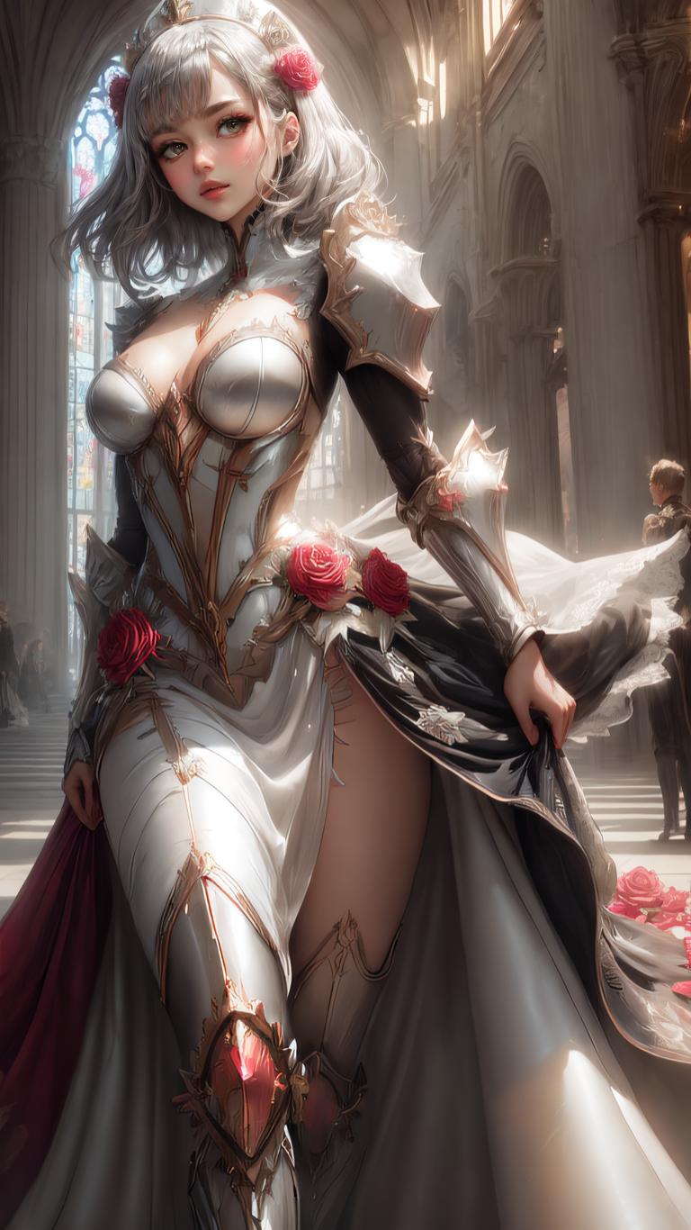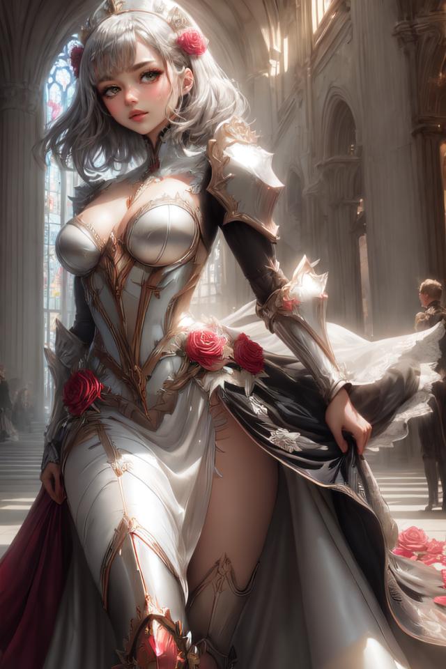 1girl, armor, armored boots , armored dress, bangs, braid, cleavage, closed mouth, clothing cutout, dress, flower, green eyes, grey hair, hair flower, hair ornament, indoors, large breasts, looking at viewer, maid headdress, medium breasts, pauldrons, red flower, red rose, rose, short hair, shoulder armor, solo, thighhighs, vambraces, white dress