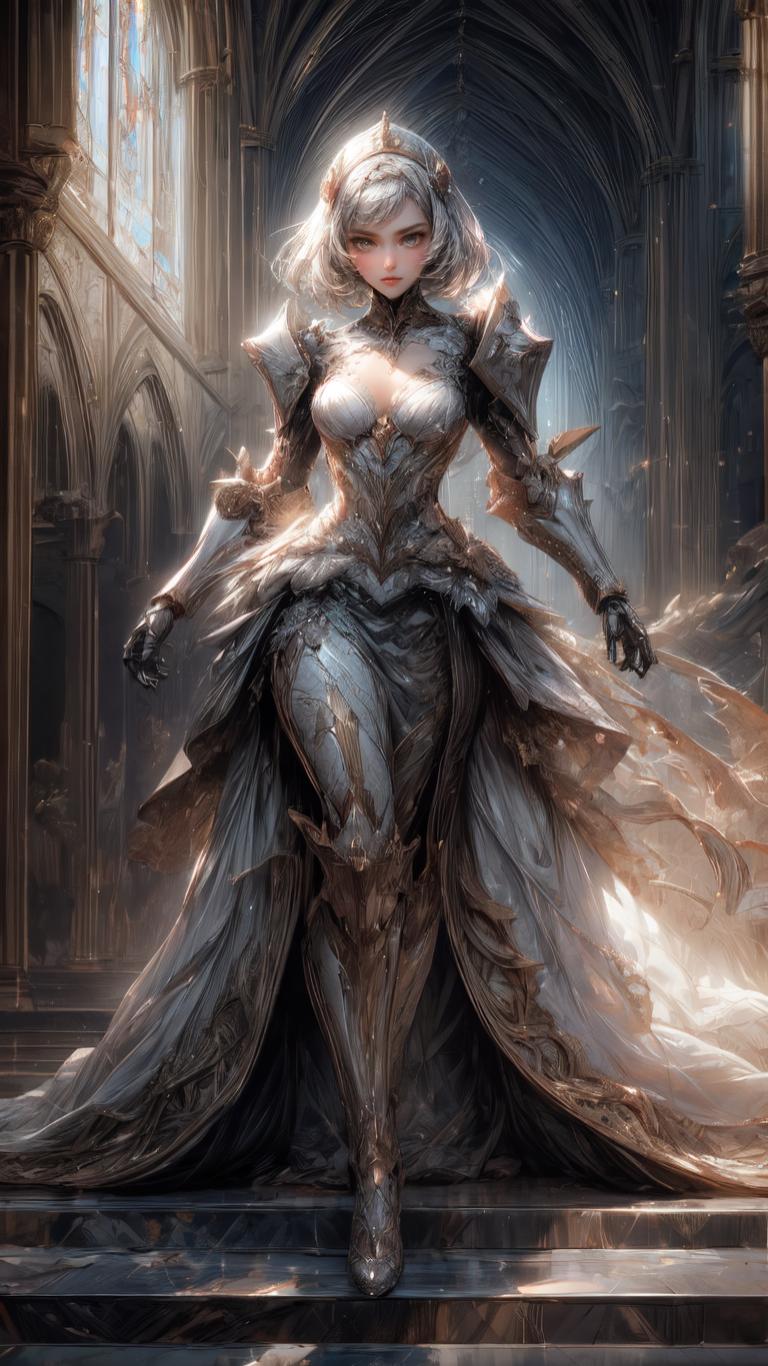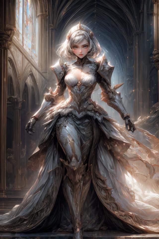 | Prompt | <lora:wrenchsilverserenade:0.5> (wrenchsilverserenade, gown, silver \(metal\) dress:1.3),