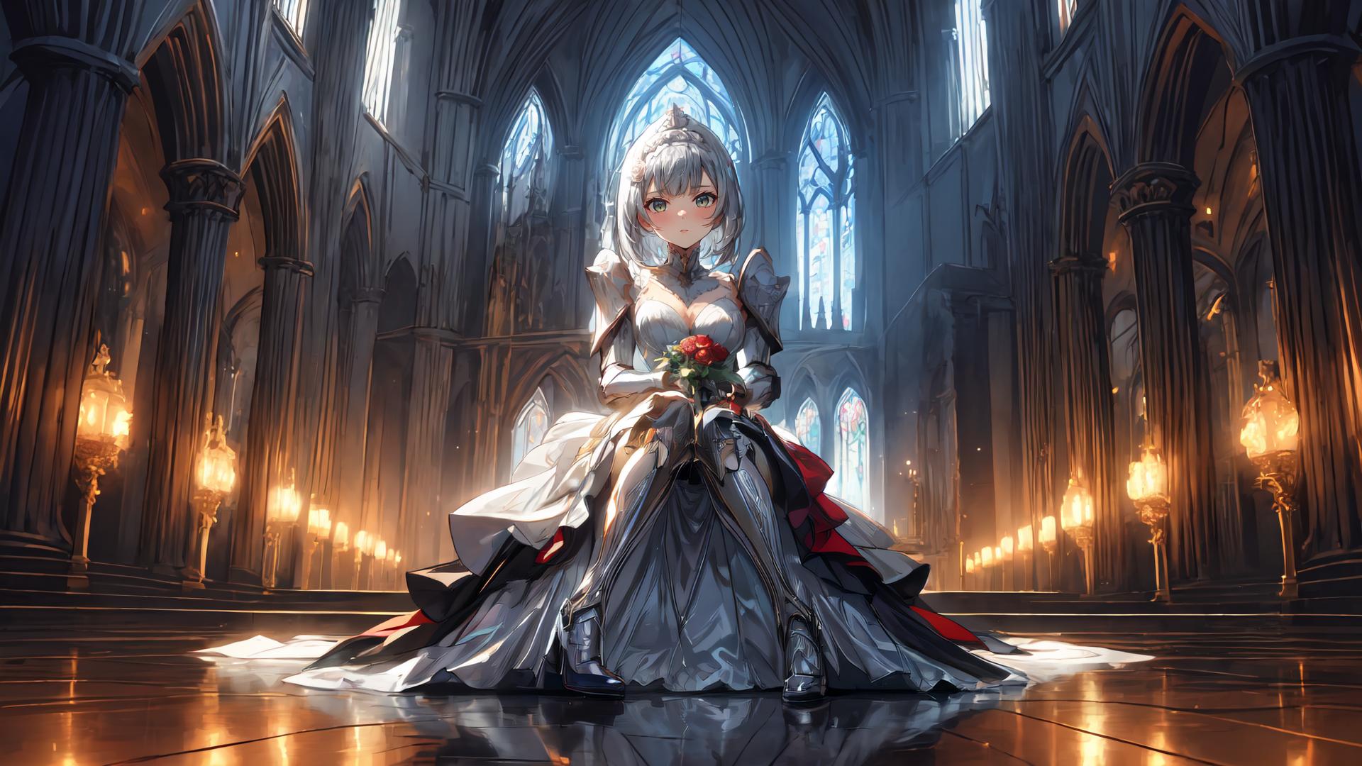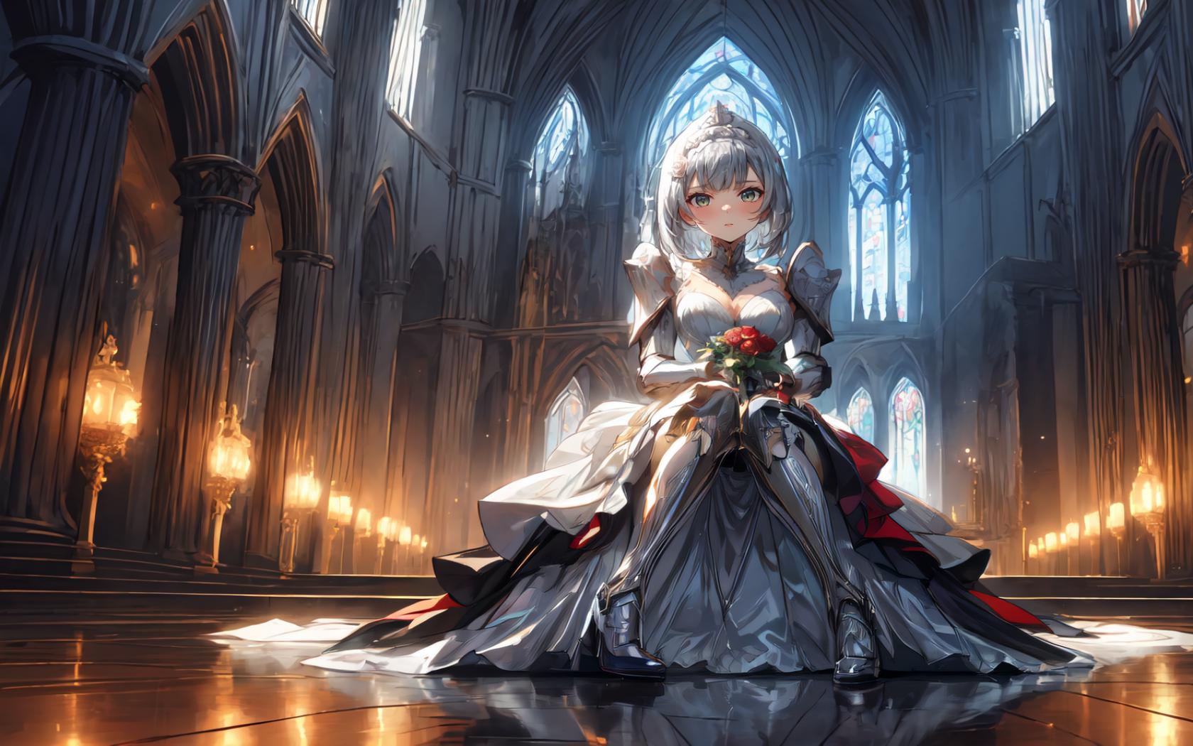 1girl, alternate costume, armor, armored boots, armored dress, bangs, blush, boots, bouquet, braid, church, cleavage, closed mouth, dress, flower, full body, gauntlets, greaves, green eyes, grey hair, hair between eyes, holding, holding bouquet, holding flower, indoors, large breasts, looking at viewer, medium hair, pauldrons, red flower, red rose, reflection, reflective floor, rose, short hair, shoulder armor, single pauldron , sitting, smile, solo, tiara, virtual youtuber, wavy hair, white dress