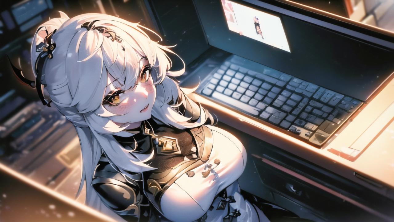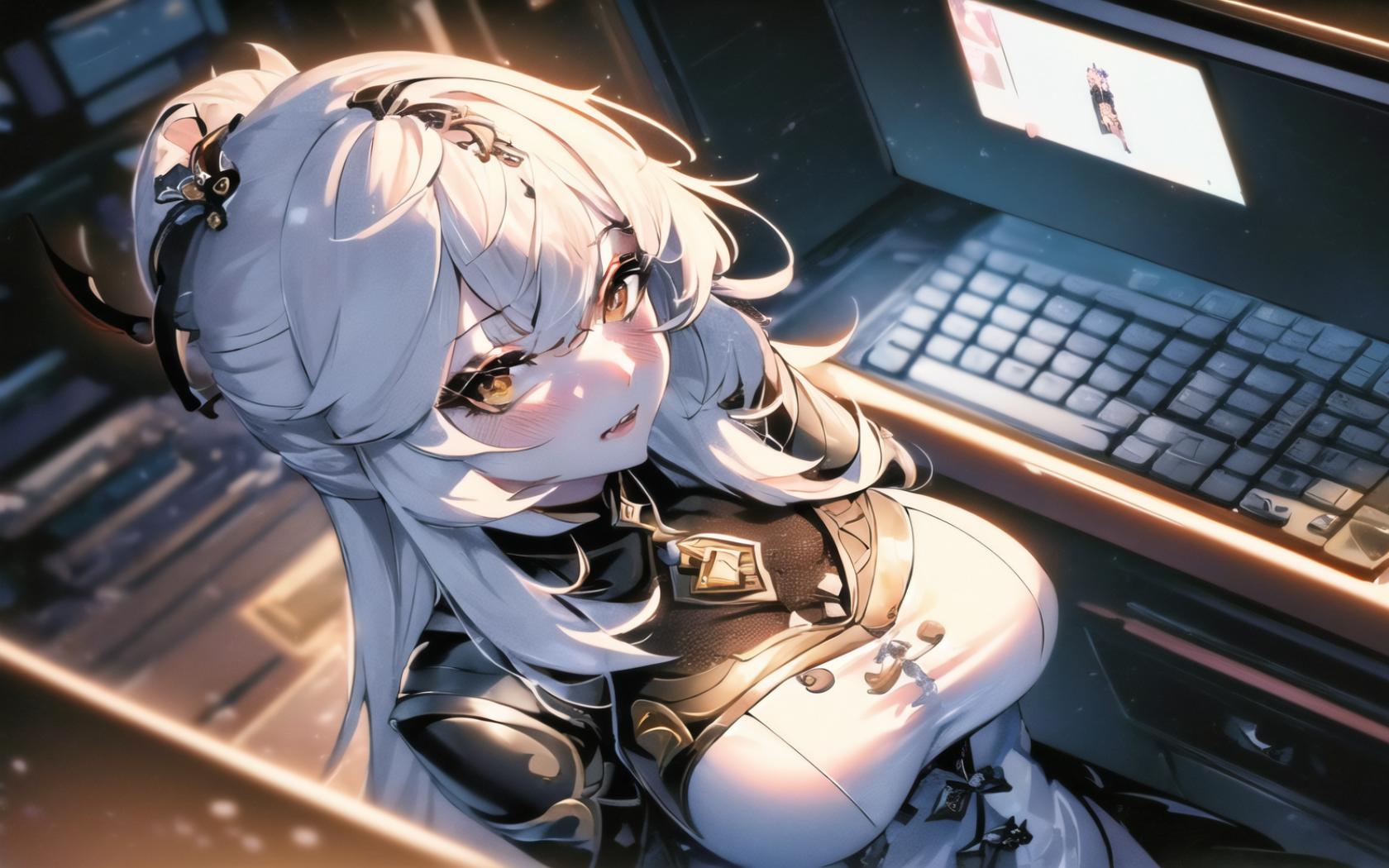 | Prompt | (highly detailed:1.5), (realistic:1.05),(digital art:1.7), <lora:beautiful-eyes:1>, (epic:1.1, perfect artwork), best quality,sharp focus,(8k), (4k),(Masterpiece), (Best Quality), extremely detailed, intricate, hyper detailed, (perfect face), illustration,soft lighting, clearly worked out detail, intricate, cinematic,(depth of field), <lora:ningguang2:0.8>,ningguangrnd, (older, mature:1.1), large breasts,(1girl, solo),(white hair:1.1), (black leather thighboots,tight white silk shirt,black leather mini-skirt,black leather suit:1.3), (day), indoors, open window,summer, trees, (inside a modern american desk office), (sitting upright on a chair at the reception desk), (using computer:1.5), plants, (portrait of (zhongli (genshin impact)) on the computer screen:1.4), serious, focused,surprised, ((blush)), (flirting with viewer:1.2), (sideview, full body:1.3), |