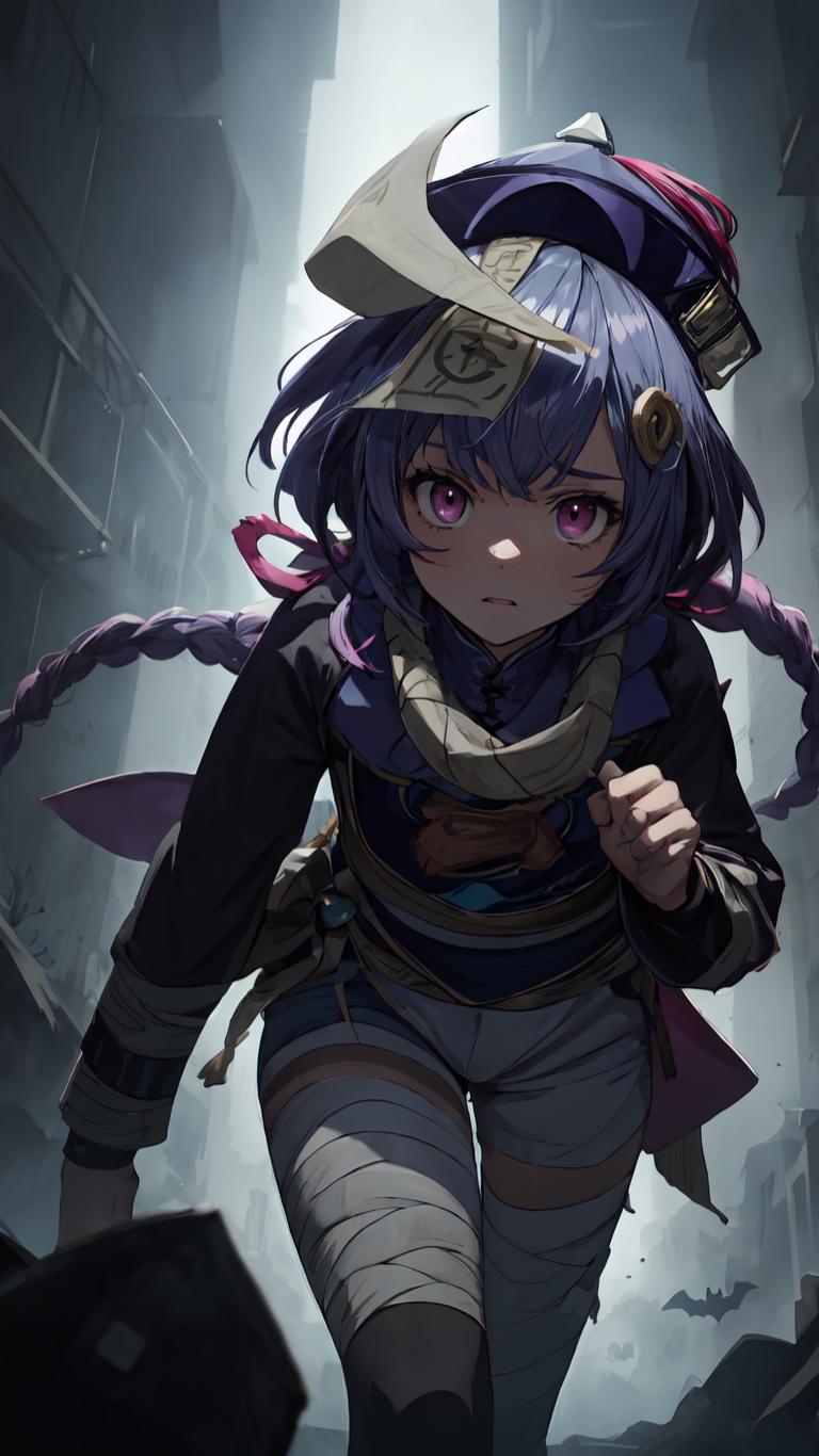 1girl, bandaged leg, bandages, bangs, bead necklace, beads, blush, braid, braided ponytail, closed mouth, coin hair ornament , hair ornament, hat, jewelry, jiangshi, long hair, long sleeves, looking at viewer, necklace, ofuda, pink eyes, purple eyes, purple hair, purple headwear, qing guanmao, shorts, single braid, solo, talisman, vision (genshin impact)