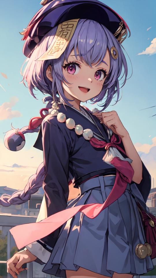1girl, :d, bag, bangs, bead necklace, beads, blue skirt, blue sky, blush, braid, braided ponytail, coin hair ornament , cowboy shot, day, hair ornament, hand up, hat, jewelry, long hair, long sleeves, looking at viewer, neckerchief, necklace, ofuda, open mouth, outdoors, pink eyes, pleated skirt, purple eyes, purple hair, purple headwear, qing guanmao, sailor collar, school uniform, serafuku, shirt, single braid, skirt, sky, smile, solo