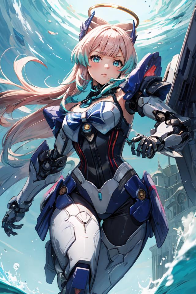 mecha musume,mechanical parts, robot joints,single mechanical arm, headgear, mechanical halo,star halo,intricate mechanical aaqua bodysuit, aqua mecha corset, full aqua armor,