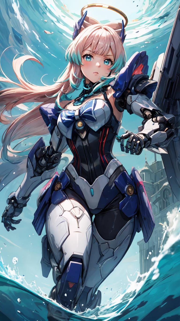 <lora:AMechaSSS[color_theme,mecha musume, mechanical parts,robot joints,headgear]:0.8>solo,alone,