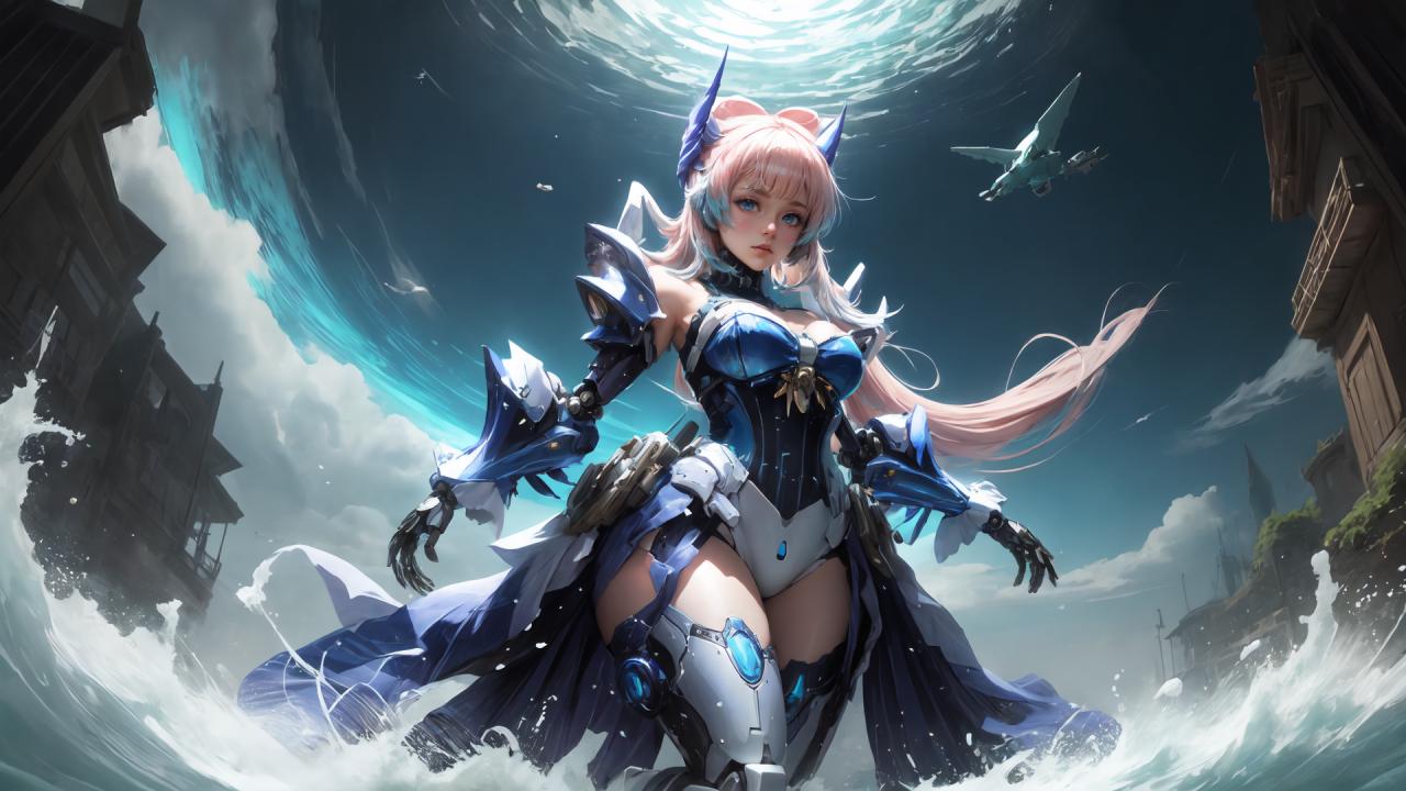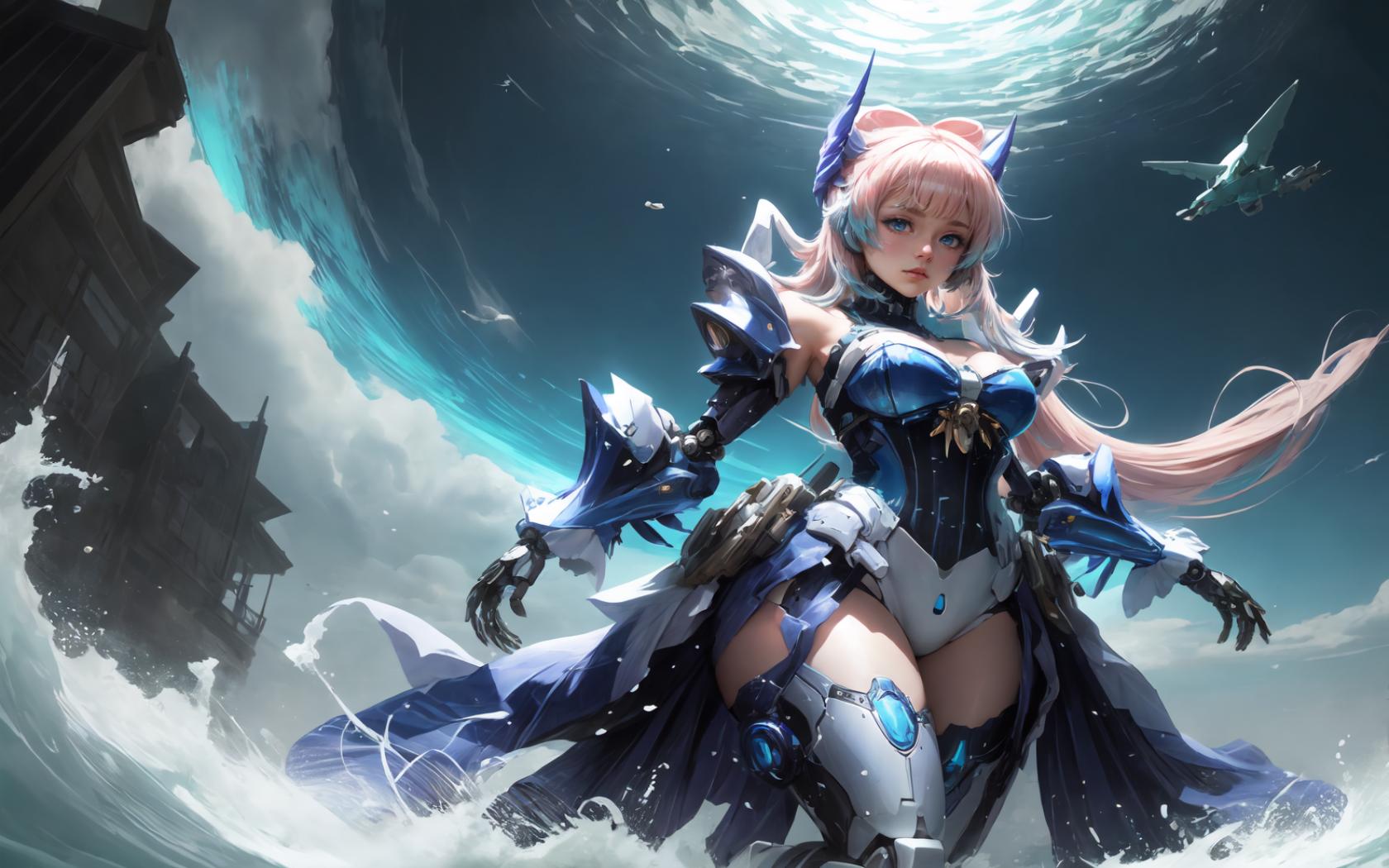 <lora:AMechaSSS[color_theme,mecha musume, mechanical parts,robot joints,headgear]:0.8>solo,alone,