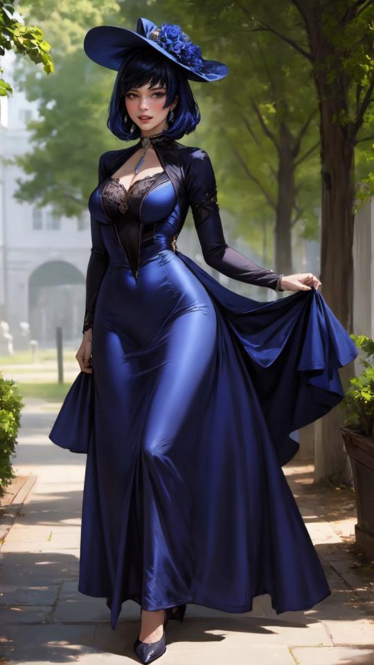 1girl, bangs, black footwear, black hair, blue dress, blue flower, blue headwear, blue rose , cleavage, covered navel, day, dress, earrings, flower, full body, futanari, hat, hat flower, high heels, jewelry, large breasts, long dress, long sleeves, looking at viewer, medium breasts, necklace, outdoors, parted lips, rose, short hair, shrug (clothing), skirt hold, smile, solo, standing, sun hat, tree