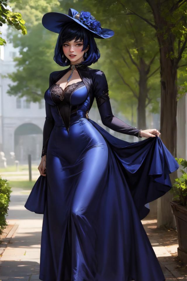 | Prompt | <lora:wrenchrococodome:0.8>, (wrenchrococodome,Eggplant black and blue dress:1.3), spiral curls, :d, hat flower,
