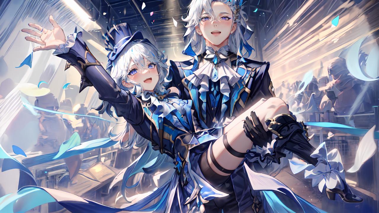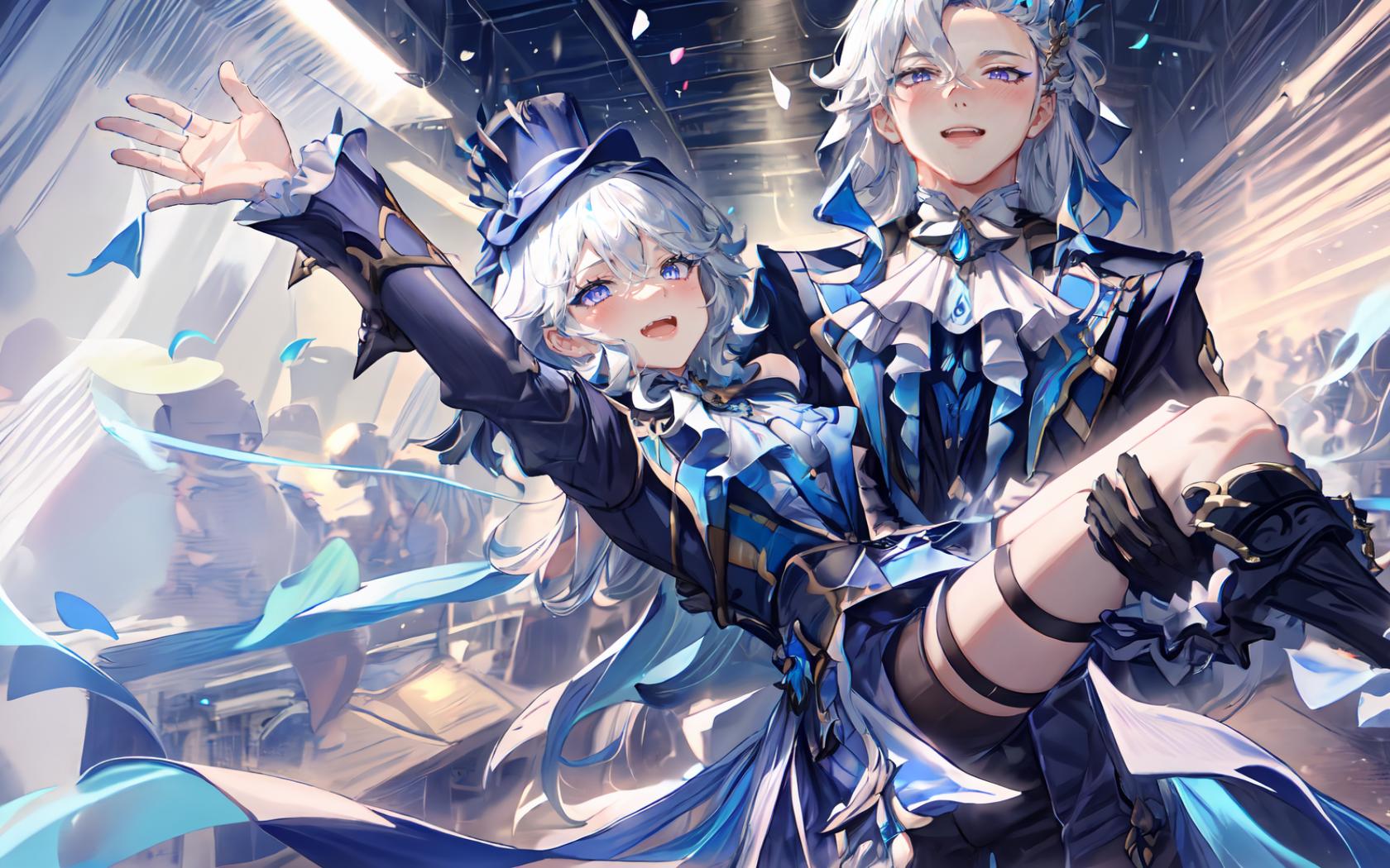 indoors,confetti, rich white marble opera background, (romantic anime art:1.6), best quality,dynamic pose,sharp focus,(8k), (4k),(Masterpiece), (Best Quality), extremely detailed, intricate, hyper detailed, (perfect face), ray tracing, light particles, <lora:more_details:0.3>